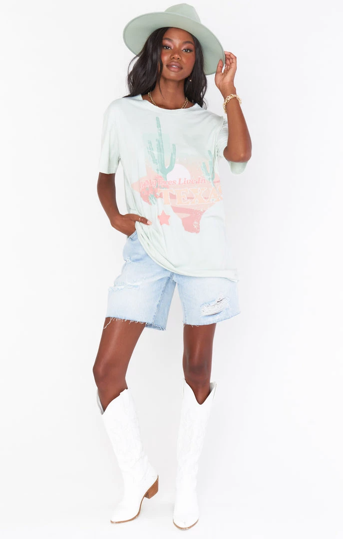 This is a new Airport Tee that we’d dearly love to have! This tee has a scoop neck with a Texas graphic. Look cute sing along in this graphic tee!