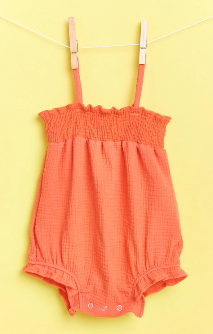 Match your mama in this bright peachy onesie! This onesie features elastic smocking and a comfy fit!