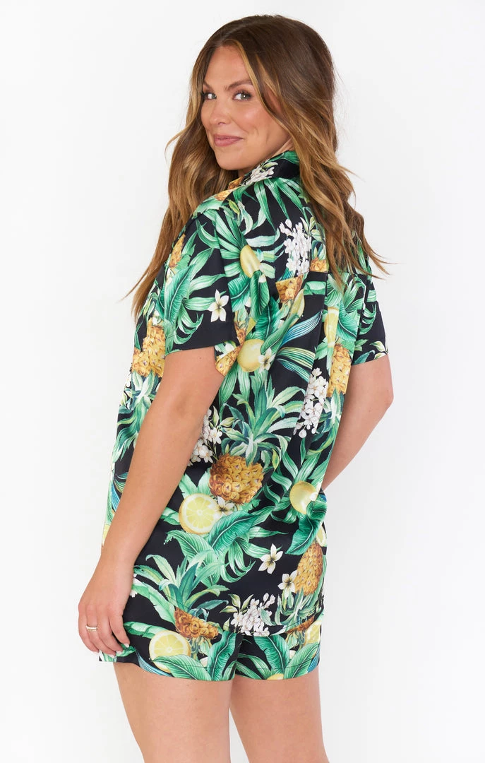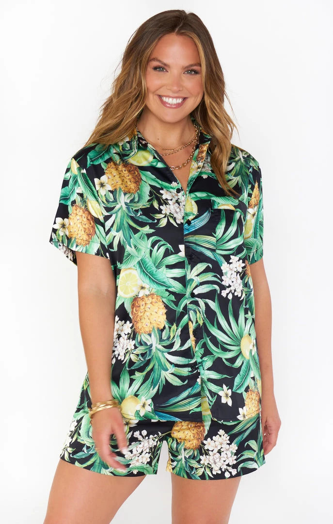 Short sleeve button down and matching shorts keep you cool at bedtime, and cool around town! Leave it unbuttoned and flowy with the Hangout Tank underneath to take this from sleeps to streets. Get the man in your life a matching set!