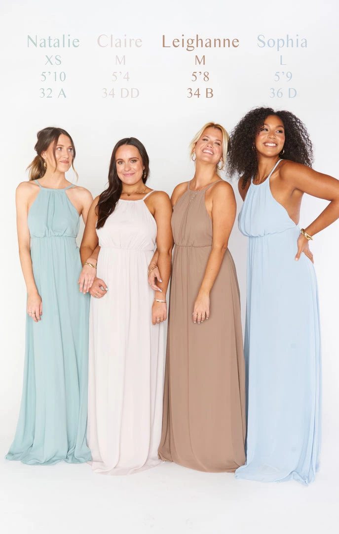 The Amanda Maxi dress is an ultra flattering high neckline maxi with an open back and a cinched empire waist with elastic in the back. For girls who need a little extra support, adding cups or altering the straps will allow you to feel secure and tucked in