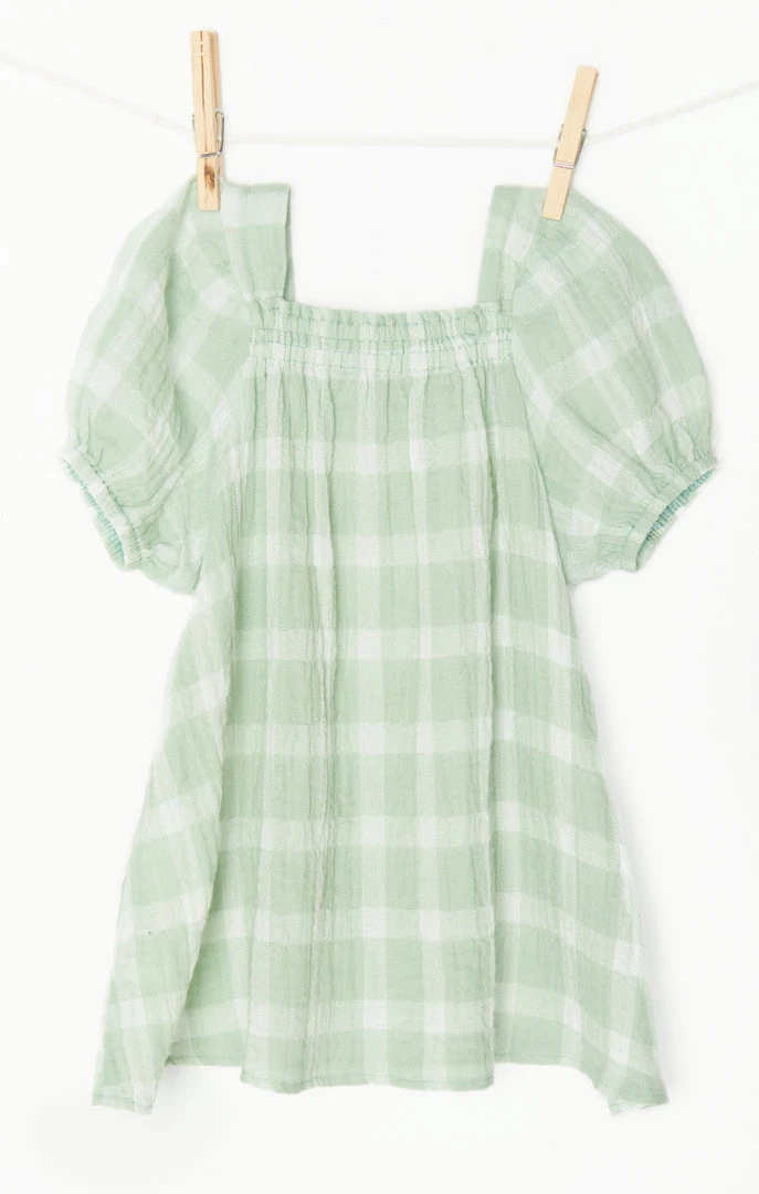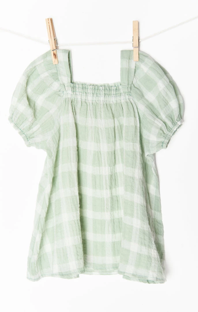 Little ones with big style in this green plaid dress. Elastic smocked top and mini puff sleeves, your mini will be the belle of the ball pit.