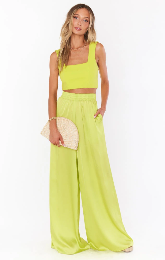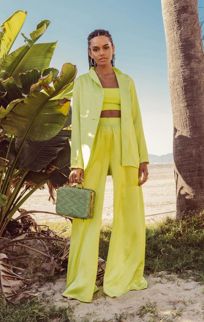 Cropped and cute, this vivid green stretch crop top is the perfect addition to any outfit. Full of possibilities, match this tight top with denim, or go full of citrine with the matching Cecilia Midi Skirt or shiny Irwin Pants and Felix Blazer.