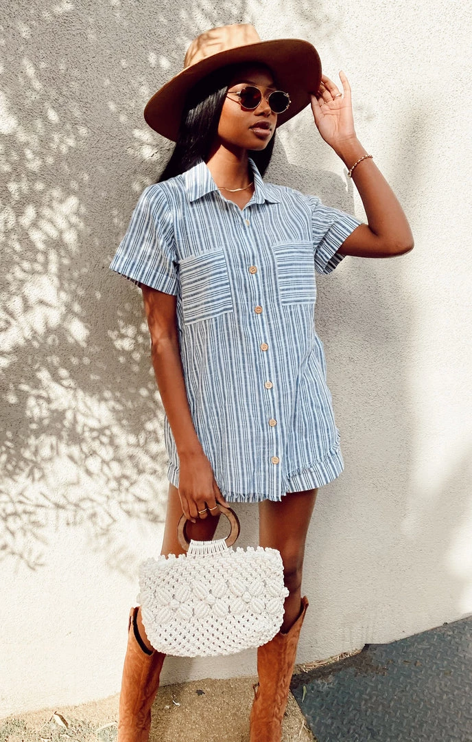 This blue and white striped Antonelli Top is a breezy linen button up that is perfect for wearing on her own or layering during those cool summer nights. She’s lightweight making it easy to button up, tie up, or tuck in to her matching Disilvio Shorts to create an effortlessly cool look.