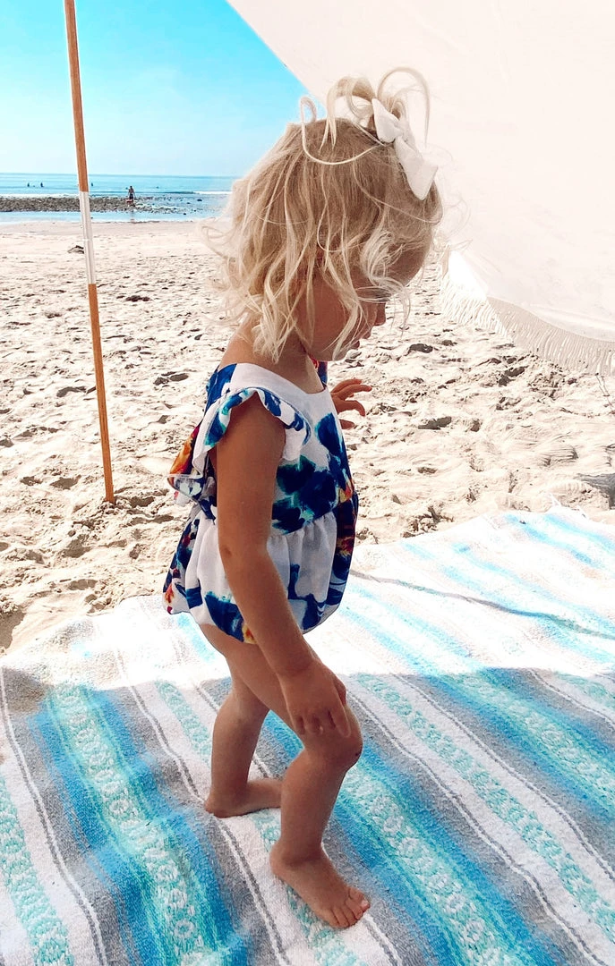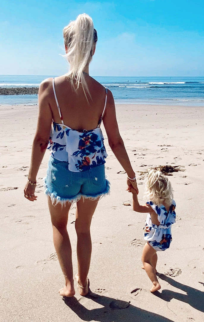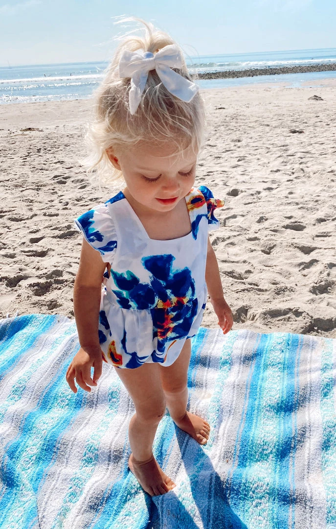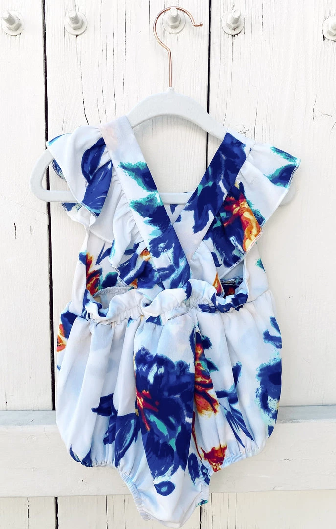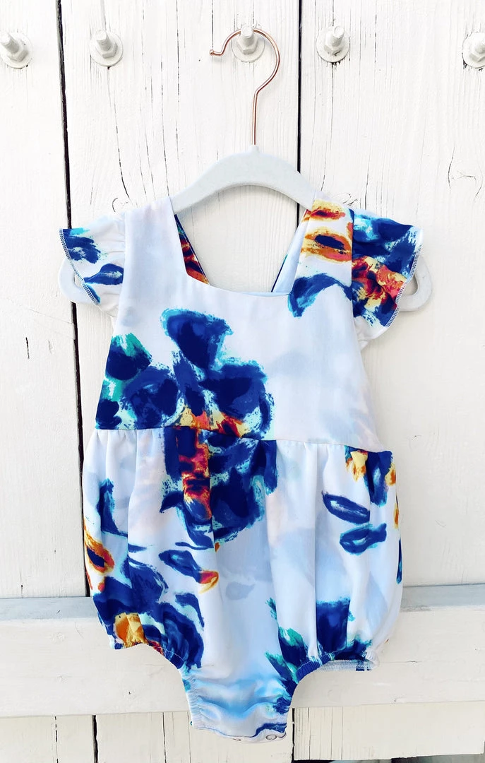 Fluttery crisscrossed straps and a breezy open back dial up the cute factor on this adorable April Ruffle Jumper. You’ll be able to match your mama in this Petal Paint print