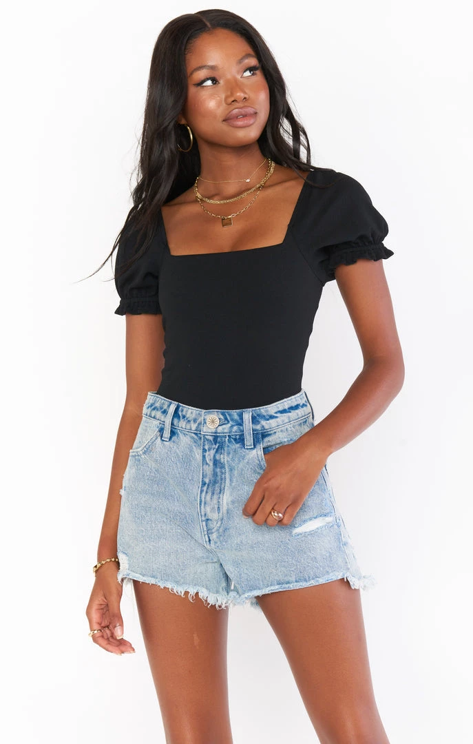 The closet staple black bodysuit you need in your life! The puff sleeves and square neck make this the perfect crossover of sensible and stylish. Our stretch material is thick enough to give you coverage and hold you in in all the right places.