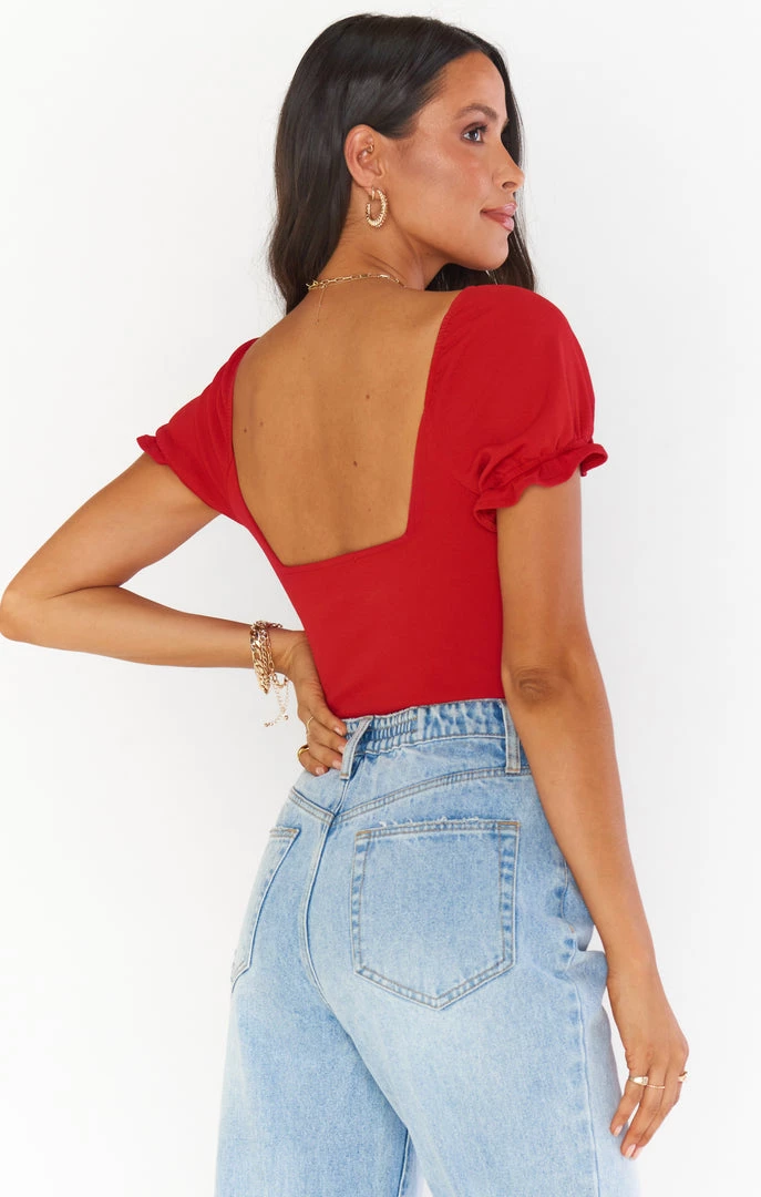 The closet staple red bodysuit you need in your life! The puff sleeves and square neck make this the perfect crossover of sensible and stylish. Our stretch material is thick enough to give you coverage and hold you in in all the right places.