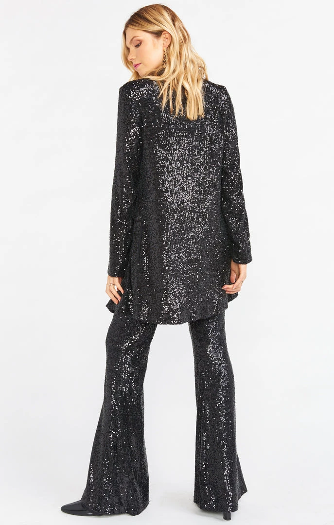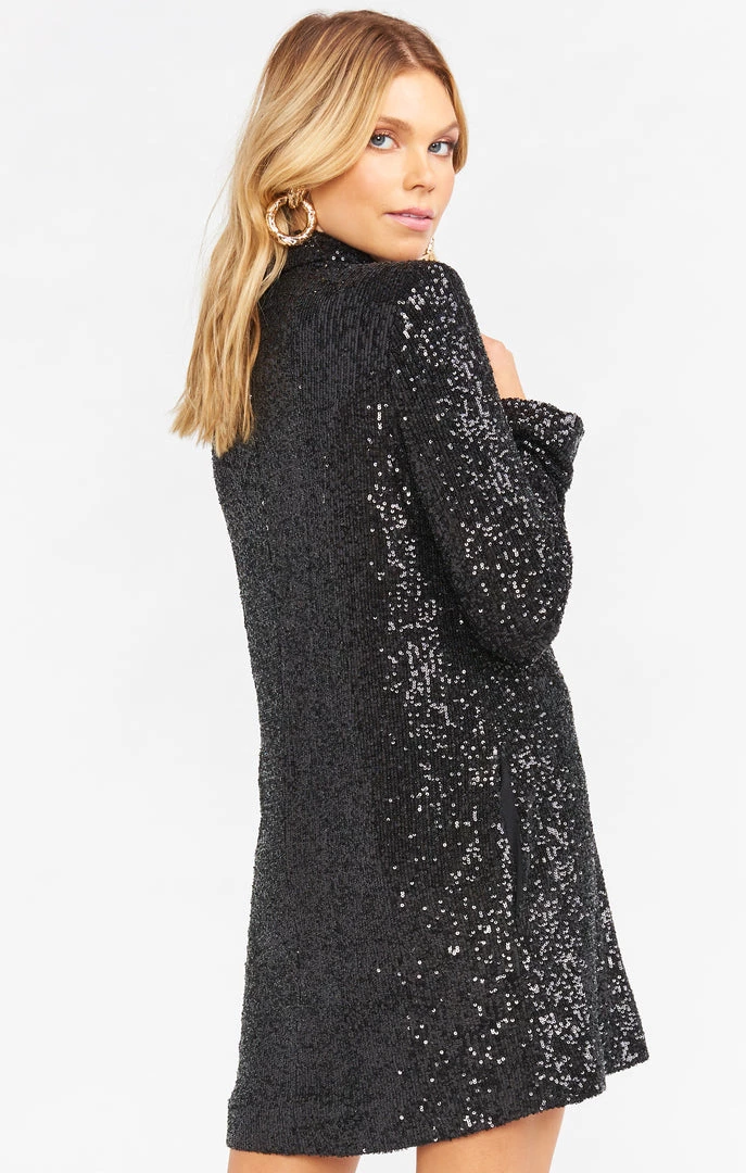 This black blazer dress has sequins all over, a v-cut neckline, and a hidden button closure to perfect the fit. Transform this dress into a sequined blazer and wear it open with the Amabella bodysuit and skinnies, or wear is closed as a dress to create the perfect party look!