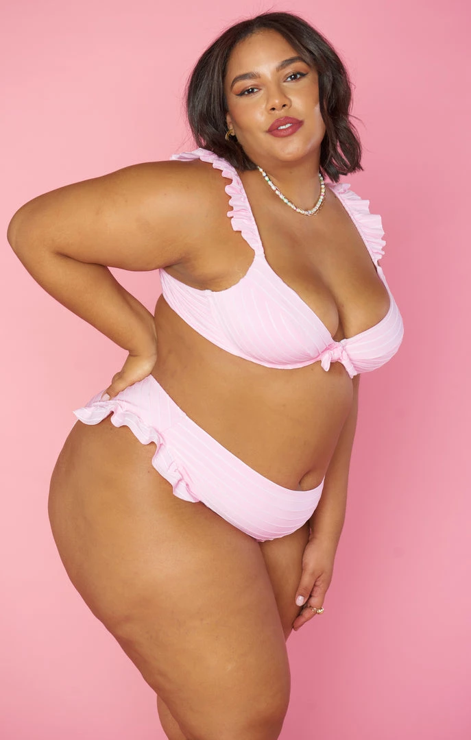 High leg and high on style in this pink ribbed midrise bikini bottom. A little cheeky and a whole lot of cute, this ruffled bottom is just what you need for all those warm weather memories! Pair with the matching Bella Top to be pretty in pink!