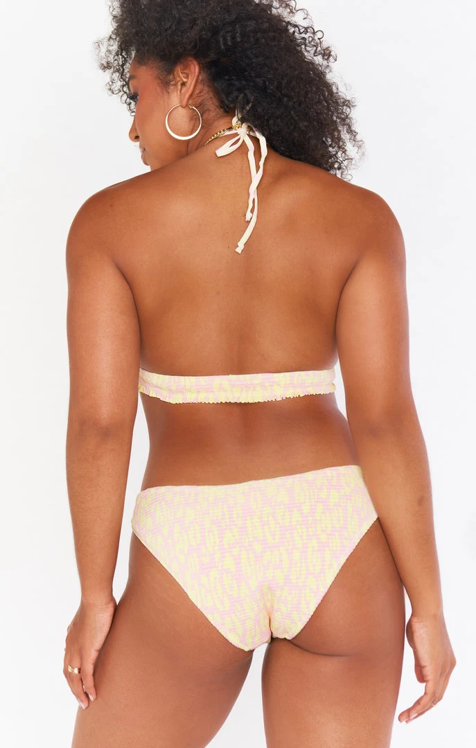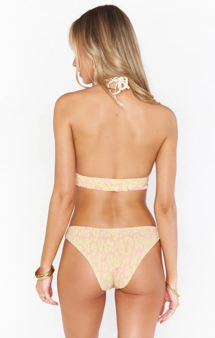 The Bermuda is a frilly bikini top with easy and adjustable halter style straps, she has a fun bright cheetah print and cool all over smocking. Pair with her matching Cozumel High Side Bottoms in Lemonade Cheetah for a sweet poolside style!