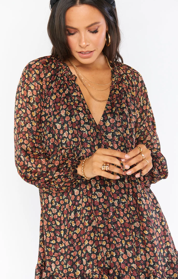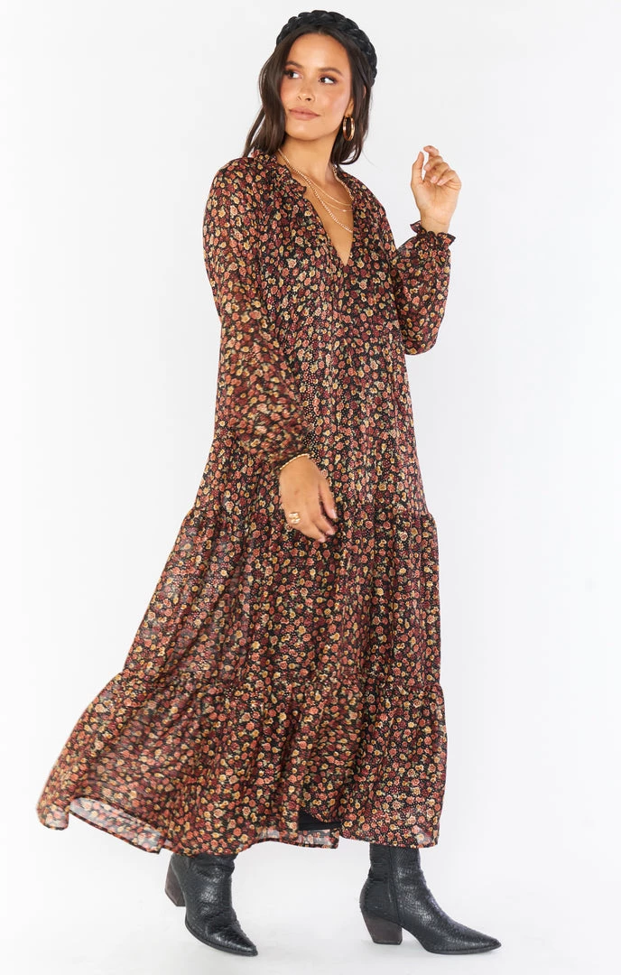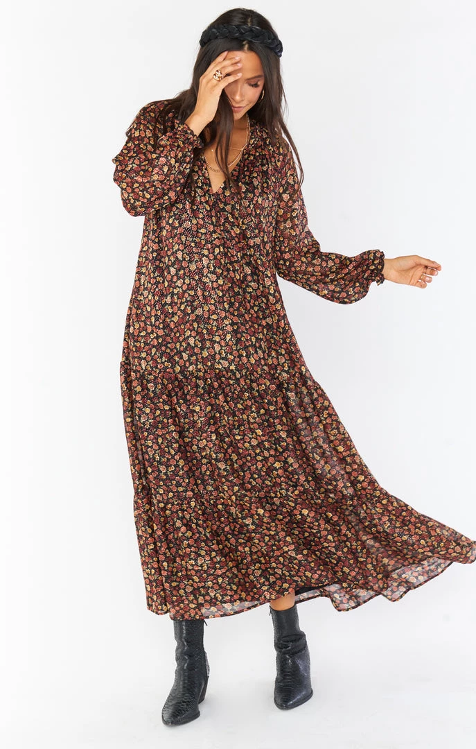 Alittle Birdie told me that this is the new go-to metallic floral tiered maxi! High on the shoulders with an open v-neck with ties give this a super relaxed vibe while still looking chic. Easily thrown on for a day of errands or can be dressed up for a nice evening or brunch!