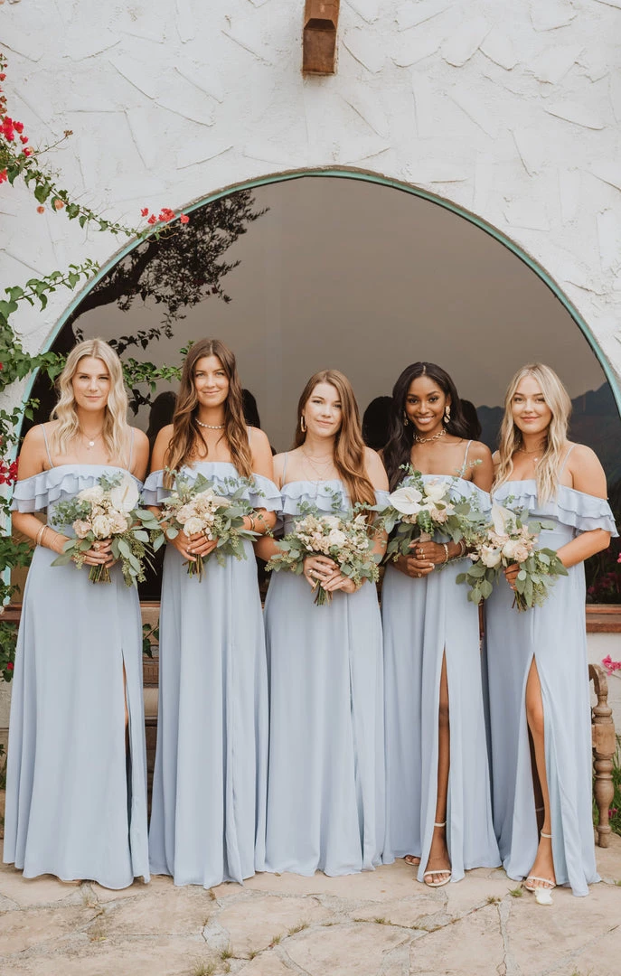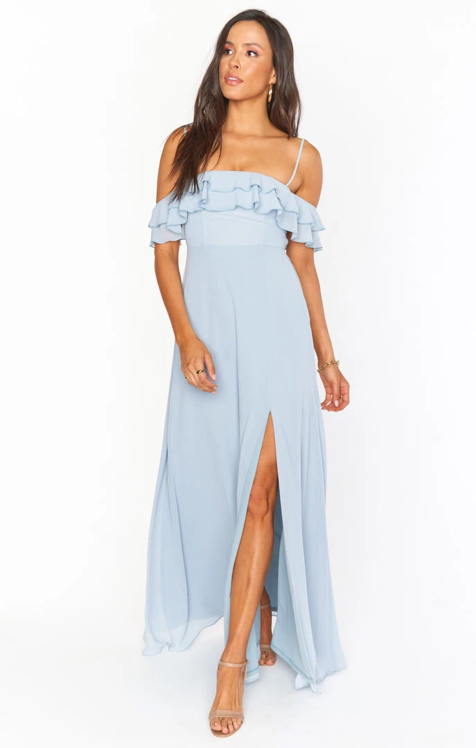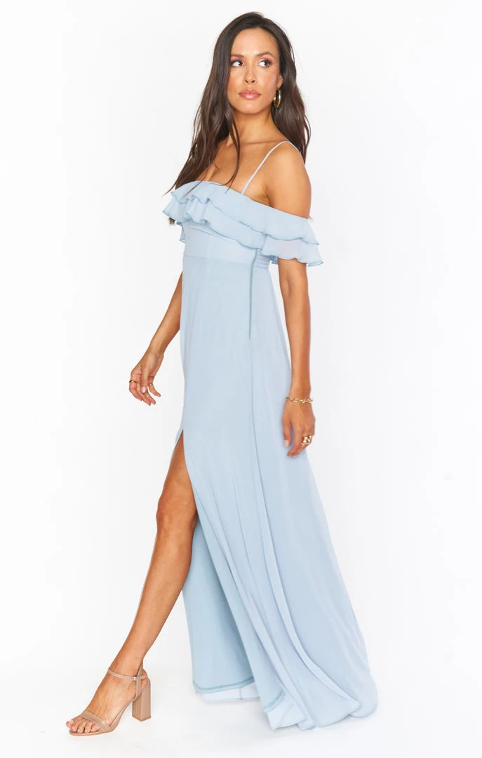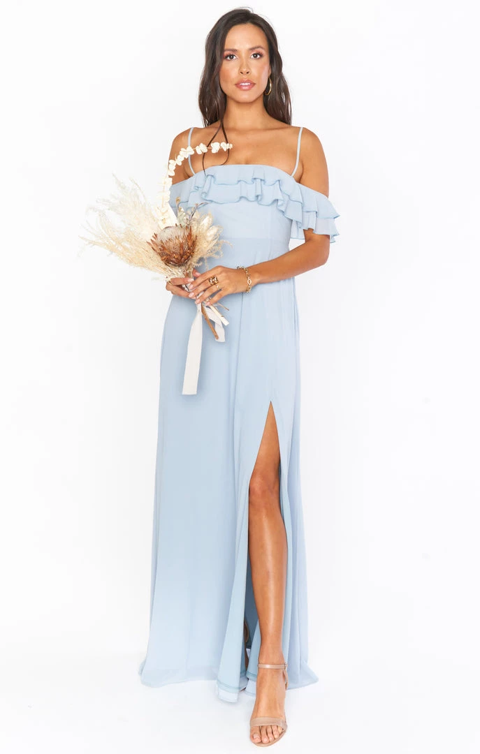 The Emma Ruffle Maxi Dress gives you the styled look of a boho two piece set with the ease and fit of a fancy maxi dress. Her double mini ruffle goes all the way around, hiding a smocked back, and can be worn off the shoulder or with your arms out for a sleeker look. The spaghetti straps can be removed if you want to go fully strapless and her side slit adds the perfect hint of skin to flatter and keep it fun for the reception.
