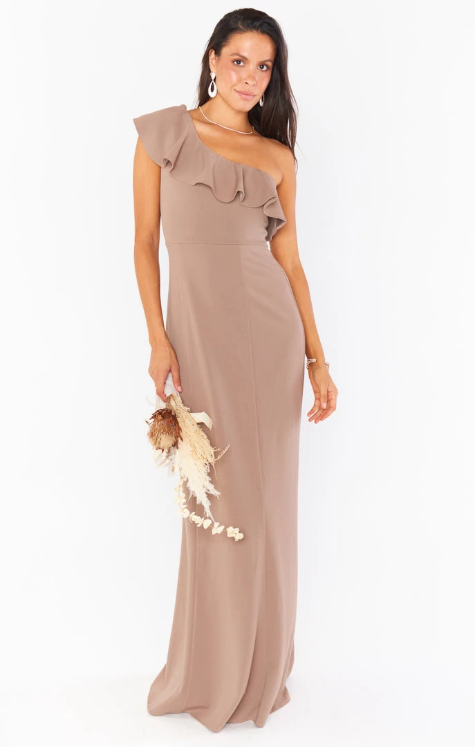 A romantic one shoulder maxi with a gentle ruffle and flattering fit. Fitted in all the right places, this super soft and form fitting maxi is strapless bra friendly if you need and might need some shapewear if you’re feelin it. But this one shoulder silhouette is super on trend for your bridesmaids or even as a guest!