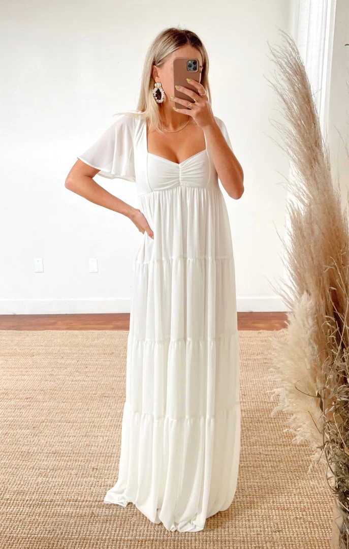 A winning combination of all our bestselling moments, this flattering maxi has a sweetheart neckline with a smocked back to ensure a perfect fit on your bust. Flutter sleeves offer dainty coverage and a tiered skirt adds the ultimate boho flow! The empire waist makes this a great maxi dress for moms to be! So whether you’re a bridesmaid or a momma with a special event to attend, the Nicole will take care of you.