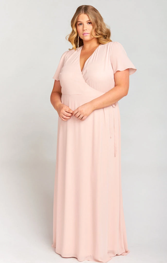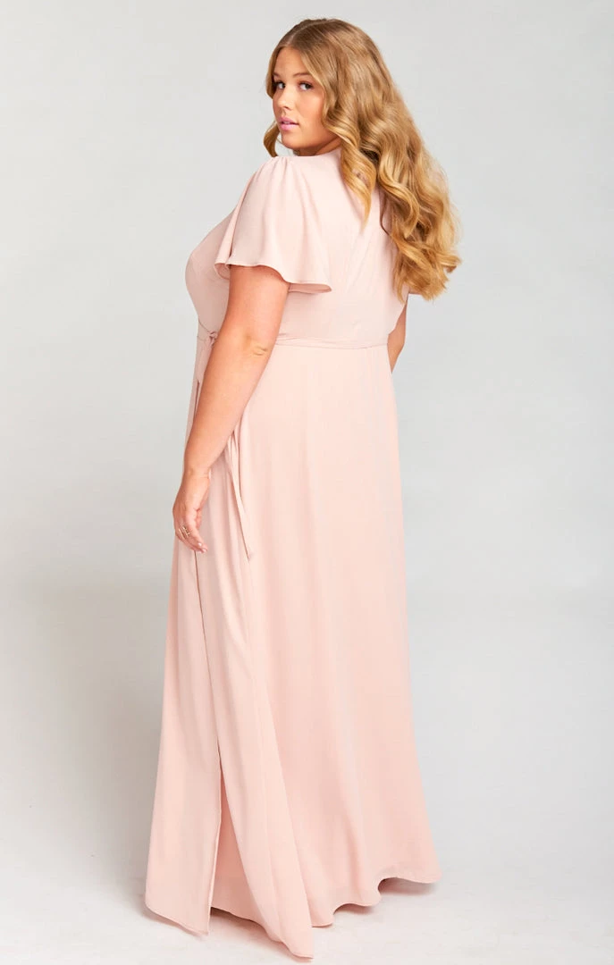 The Noelle Flutter Wrap Dress has all the perks of a maxi with the fit of a wrap dress. Classic V in the front with a filled in back compliments a flutter sleeve and full slit created by the wrap. Ties can be wrapped twice to perfect the cinch at the waist.