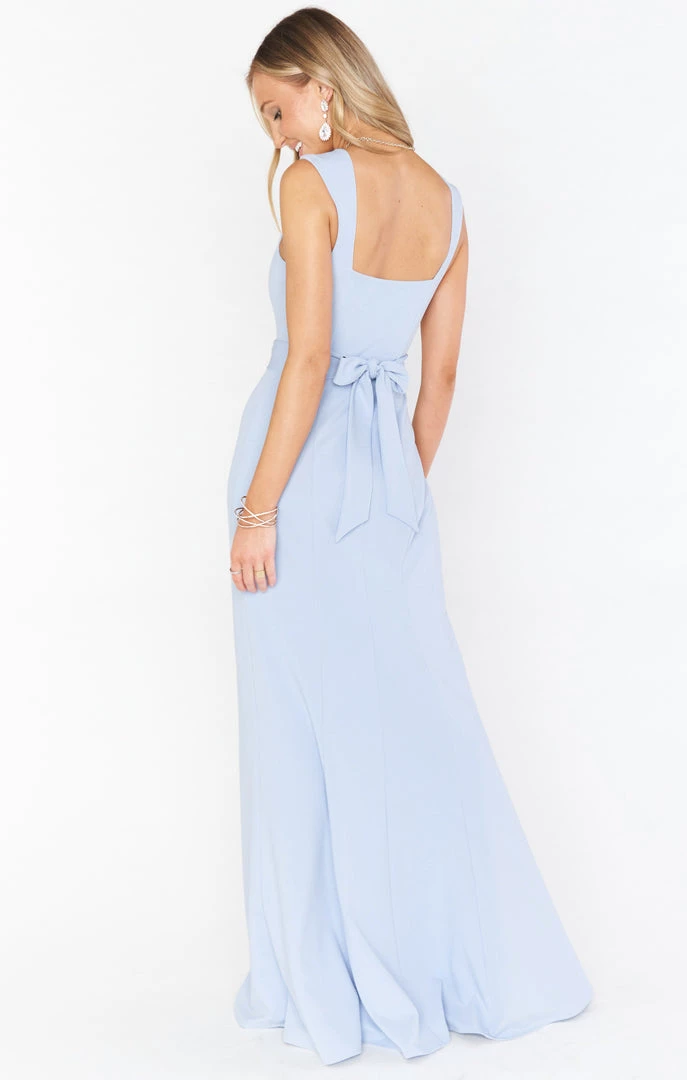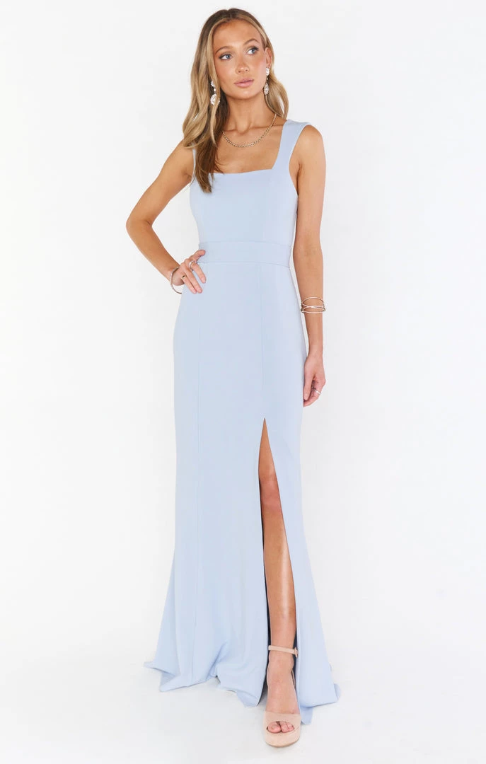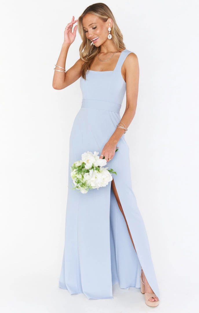 This formal maxi brings an element of cool to a classic silhouette with a side slit for a little pop of leg. Thicker straps and a square neck are ultra flattering in this form fitting gown while the super stretchy fabric leaves you comfortable from ceremony to reception. Comes with a detachable sash making this dress a chic choice for a modern bridesmaid and super re-wearable for a special event.
