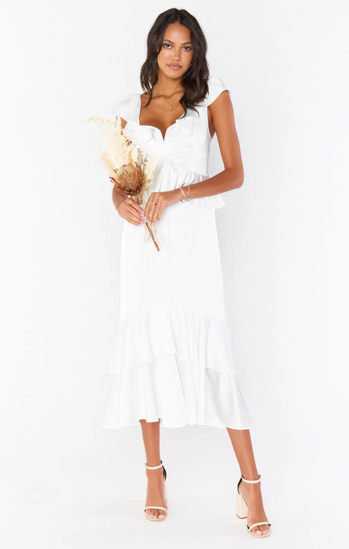 Feminine and flirty, this white ruffled tiered midi dress is as romantic as they come. The ruffles and flutter sleeves make this dreamy dress the utmost flattering, and smocked back ensures the perfect fit.
