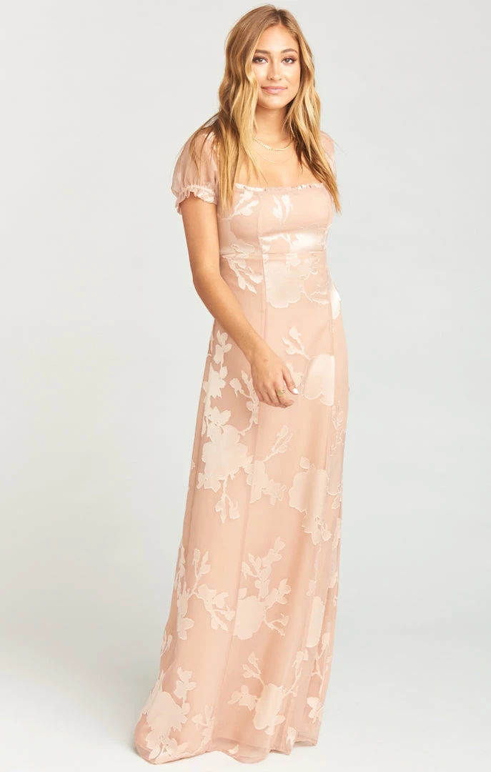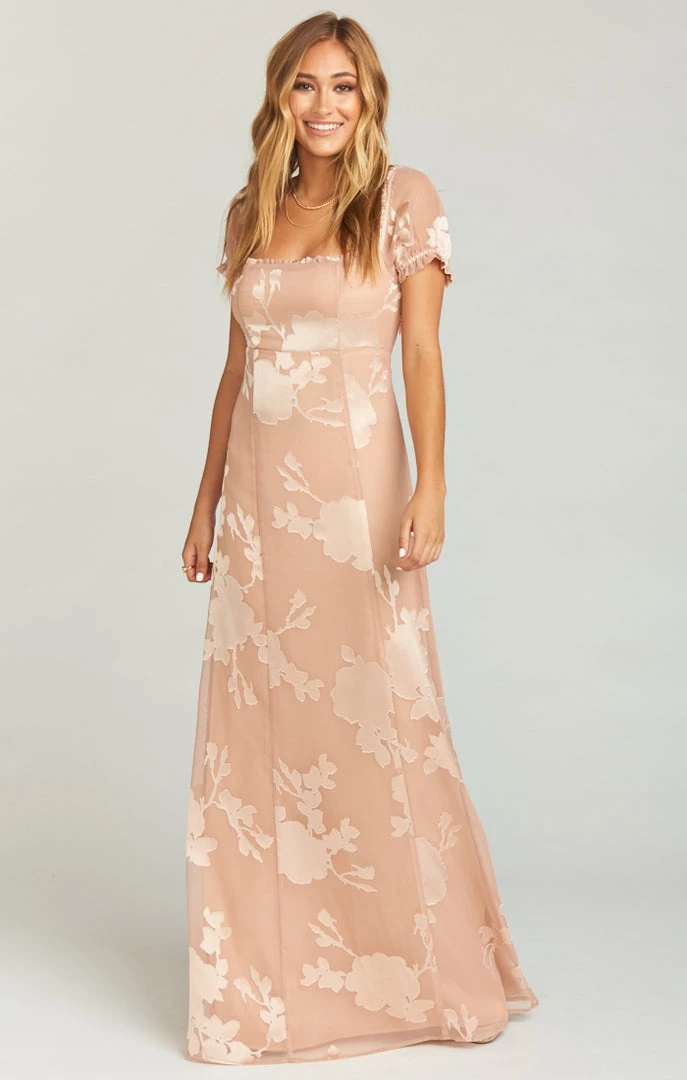 Brittany Maxi Dress is an elegant and classic style with delicately poofed sleeves, a fitted bust that flows out to a full maxi skirt.