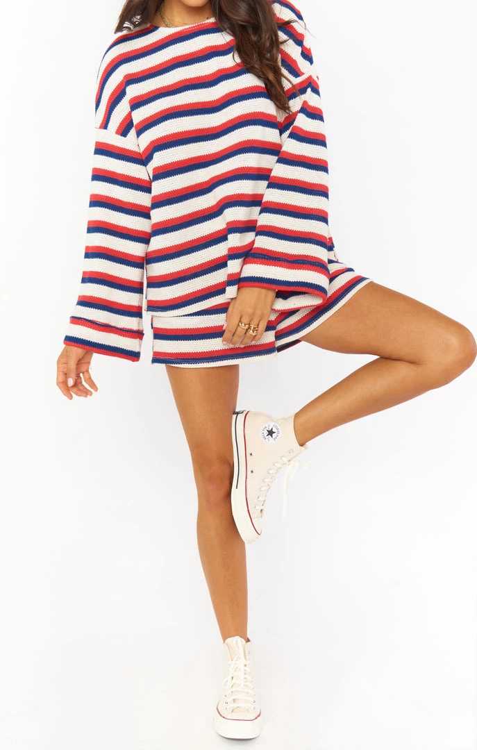 SKU: show-me-your-mumu-6561326759979 Categories: Bottoms, Bottoms, Clothes, Cover Ups, Cozy Sets, Dresses + Rompers, Matching Sets, New Mu, Shorts, Sweaters + Cozy, Swim Tags: Child:Patriot Stripe Knit, Cover ups, Cyber_sale_21, Final_sale, Out Of Stock, SU21SALE, Type:bottoms, Type:cozy & pjs