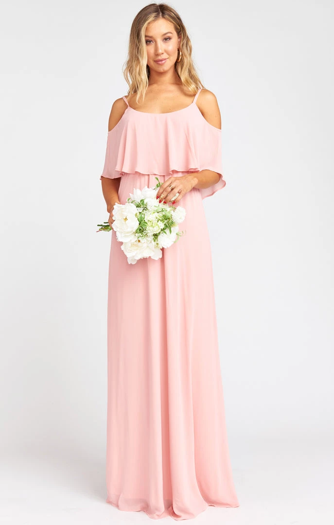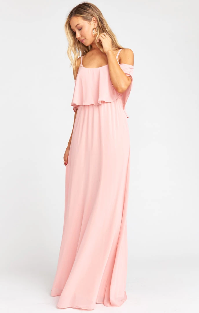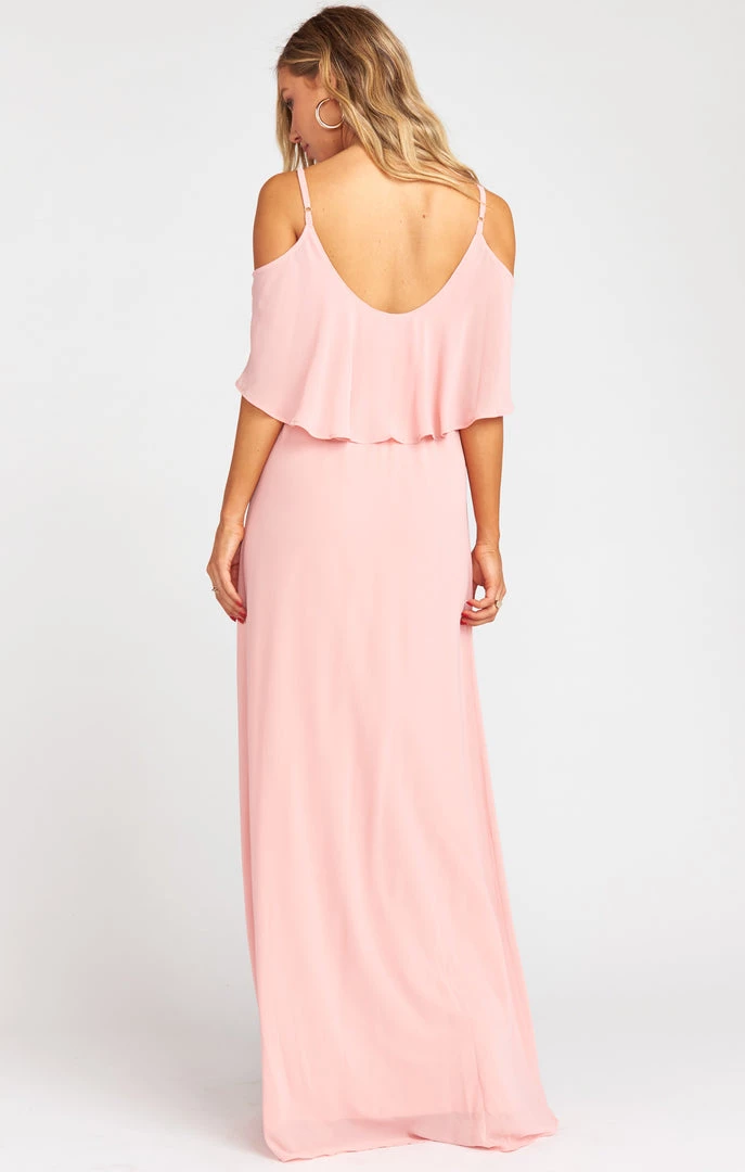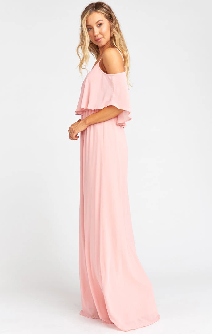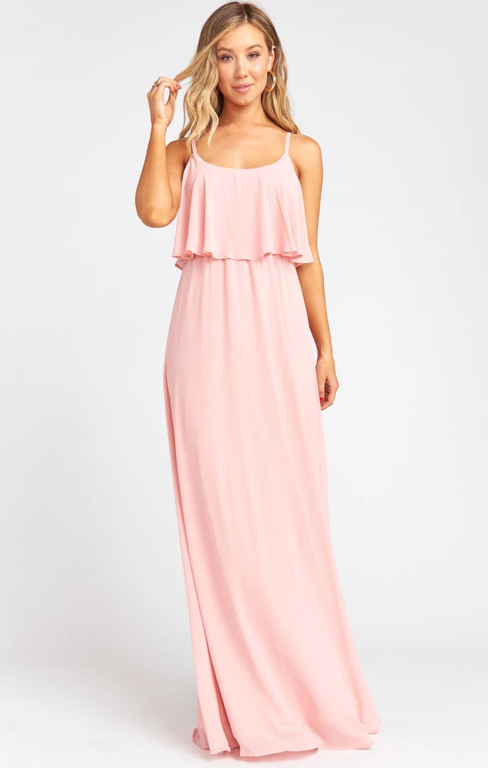 The Caitlin Ruffle Maxi flutters and flows from top to bottom. She’s extremely versatile, so wear her as a classic spaghetti strap or make her into a cold shoulder!