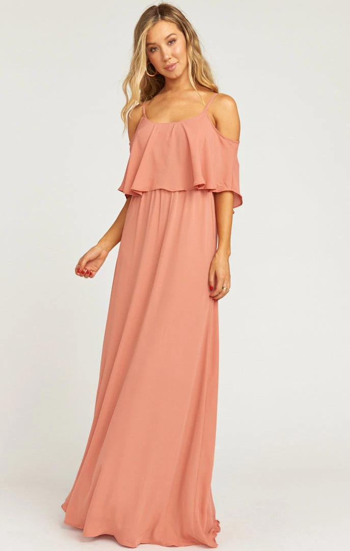 The Caitlin Ruffle Maxi flutters and flows from top to bottom. She’s extremely versatile, so wear her as a classic spaghetti strap or make her into a cold shoulder!