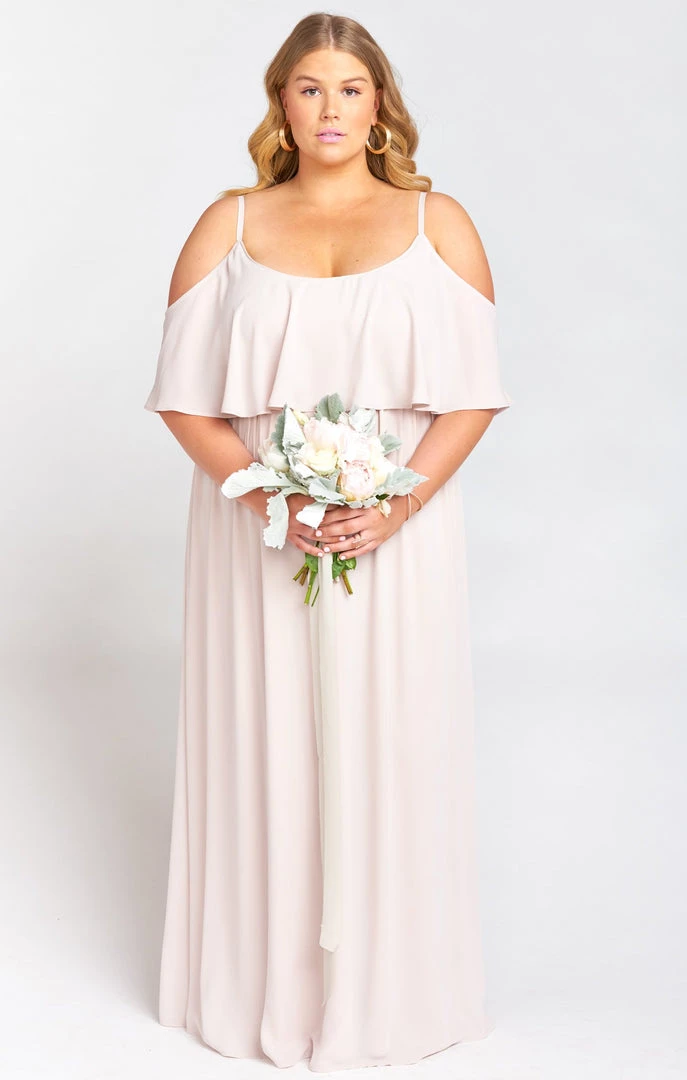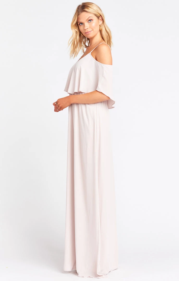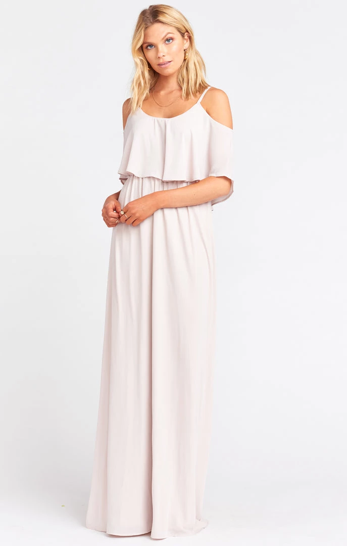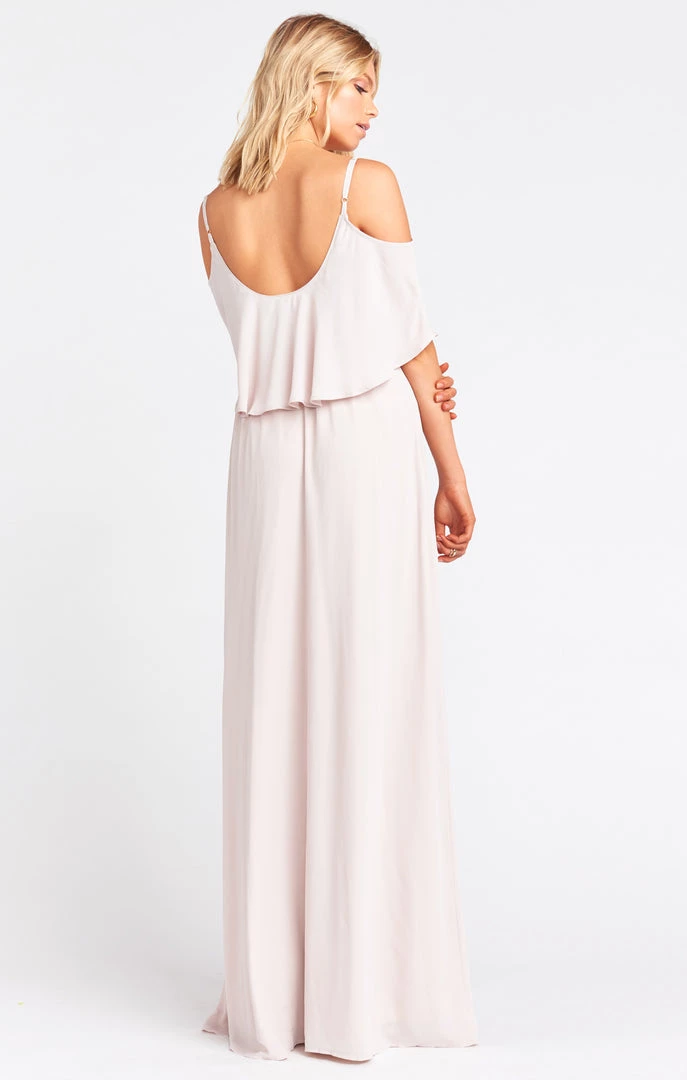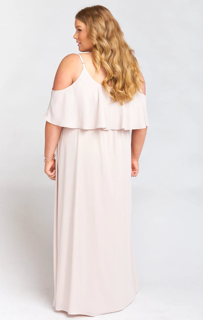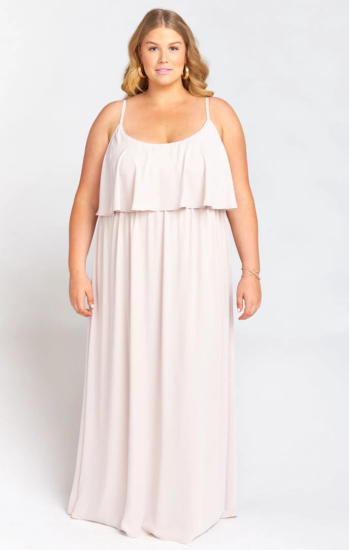 The Caitlin Ruffle Maxi flutters and flows from top to bottom. She’s extremely versatile, so wear her as a classic spaghetti strap or make her into a cold shoulder!