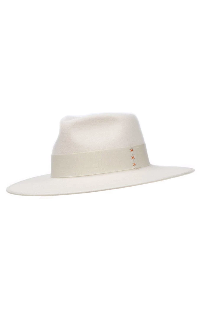 Made of 100% Australian wool, the Ford is a stiff brimmed wool fedora with a high rigged crown design featuring complimenting gross grain edging, a wide ribbon detail and finished with x stitching.