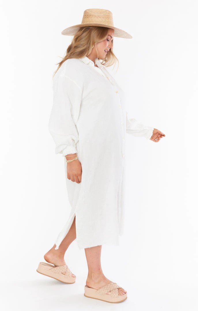 Hit the sand or seas in this classic gauze long sleeve button down dress. Wear it open over swim, or button all the way to move from beach to beach bar!