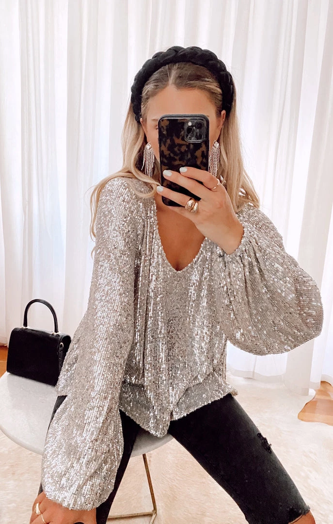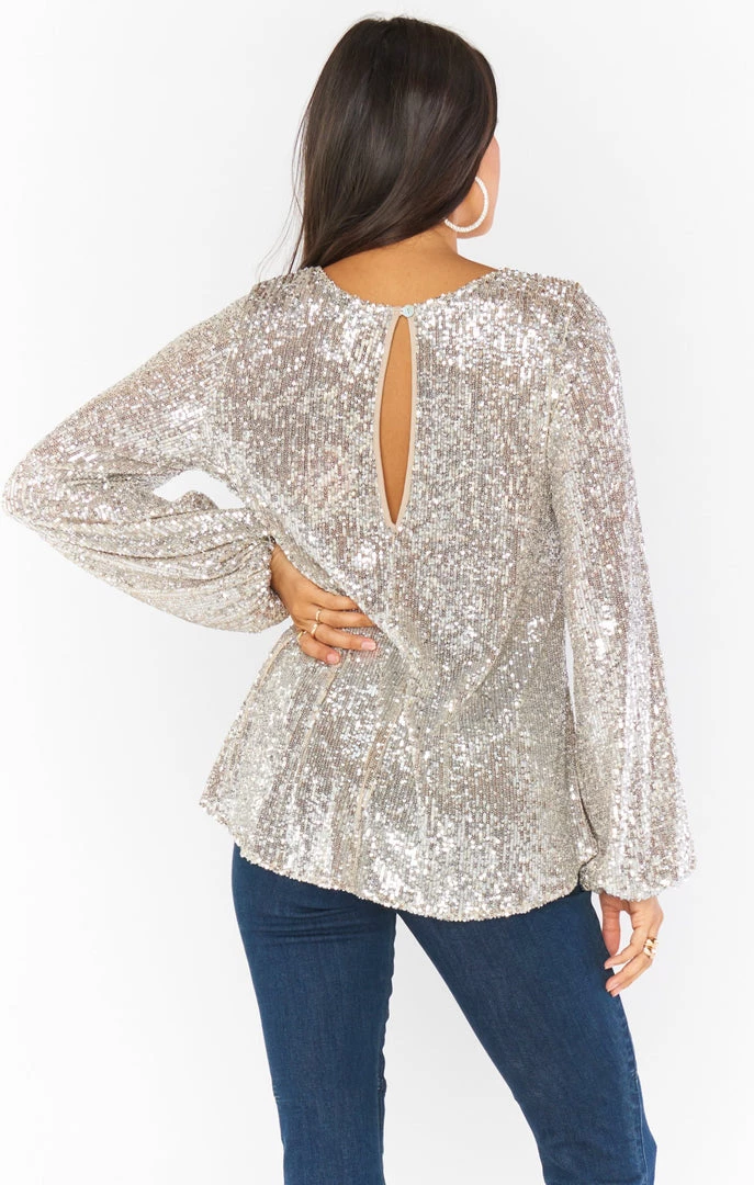 Throw this amazing sequin blouse on and become the life of the party! With killer bubble sleeves, a classic V-neck cut, keyhole cutout in the back and easy billowing silohuette you will want to dance the night away!