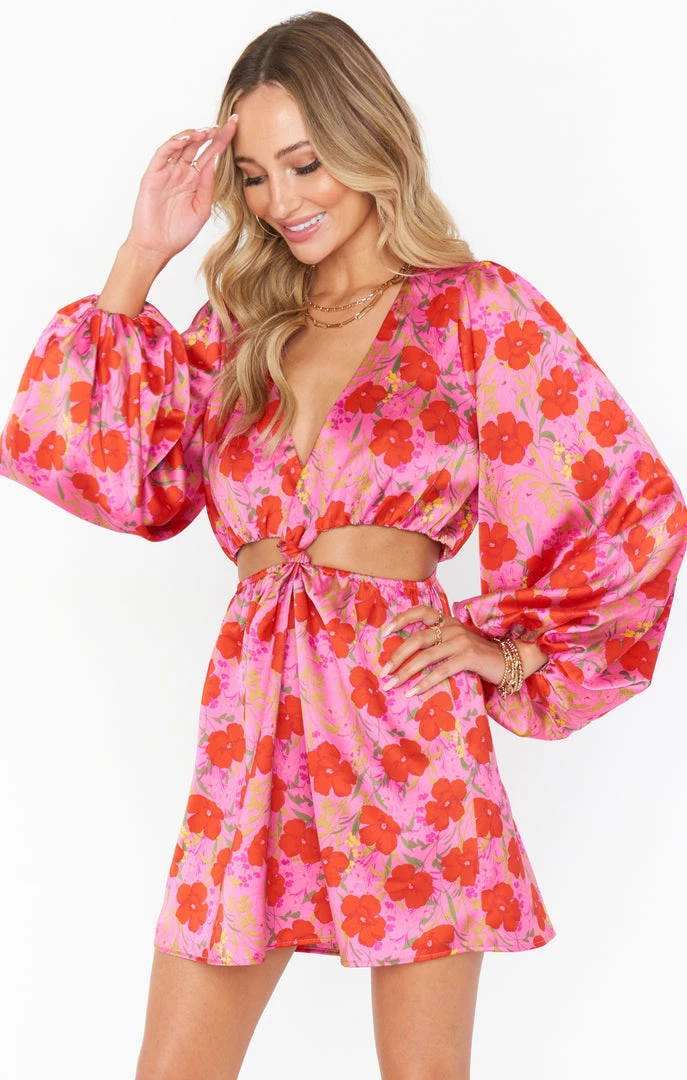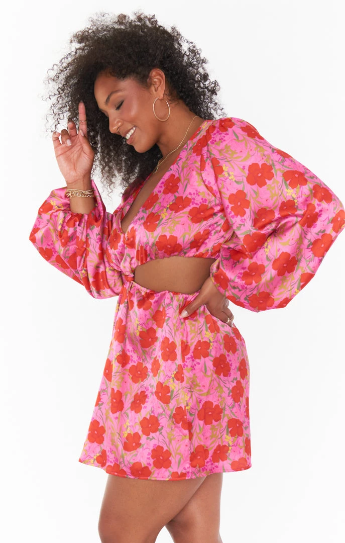 Flirty and floral, this pink and red flower print mini cut out dress is the number your closet is missing! Long draped sleeves lead to side cut outs with a playful knot to keep it all together. Dress this up for this seasons occasions or throw on boots for a femme floral look!