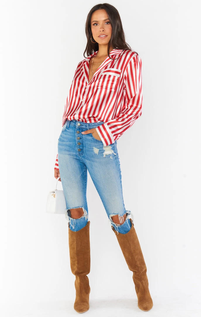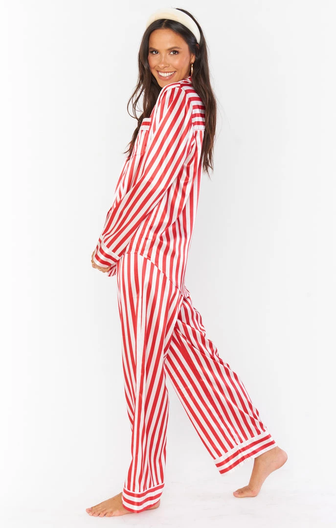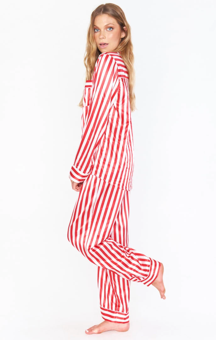 Sleep tight in these super silky button down pajamas! Sold as a set, these classic red striped pjs have a drawstring and elastic waist