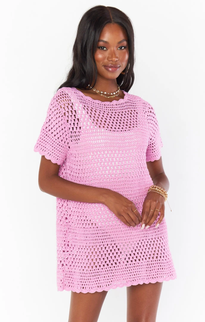 Crochet is having a moment and we are all about it! This bright lilac crochet mini dress is the perfect coverup for beach to poolside bar. Short sleeve and mini length, this is fun and flirty while providing coverage. For added length, we suggest sizing up!