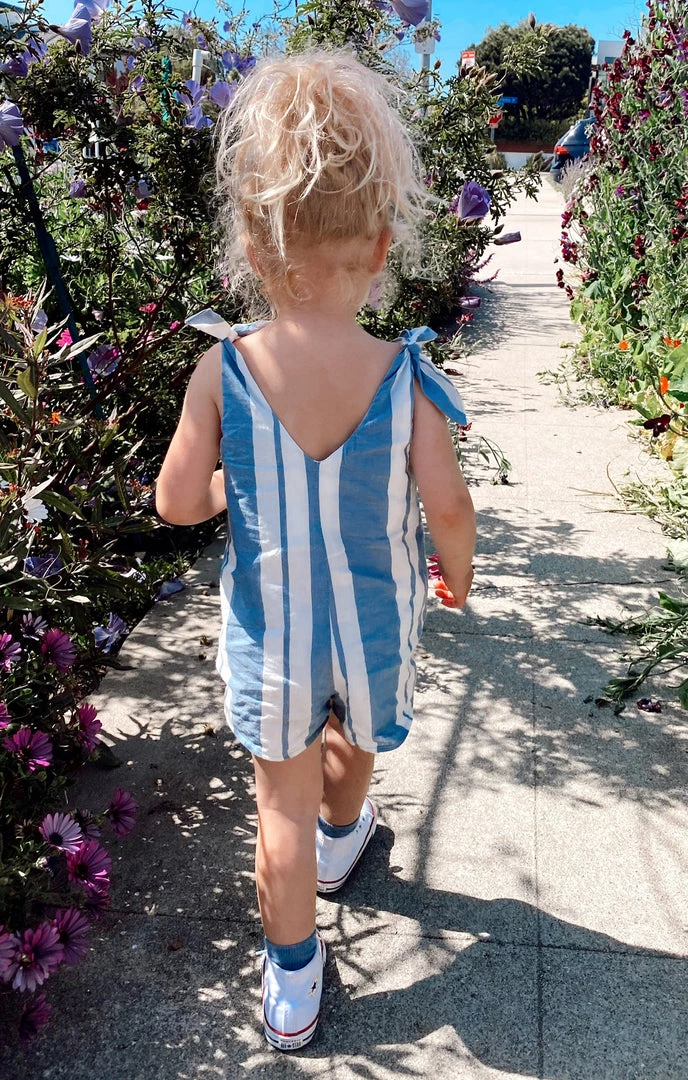 Twinning is winning in this blue and white striped mini romper! Just like Mama’s Tilda Tie these tie straps make for an easily adjusted outfit for your mini.