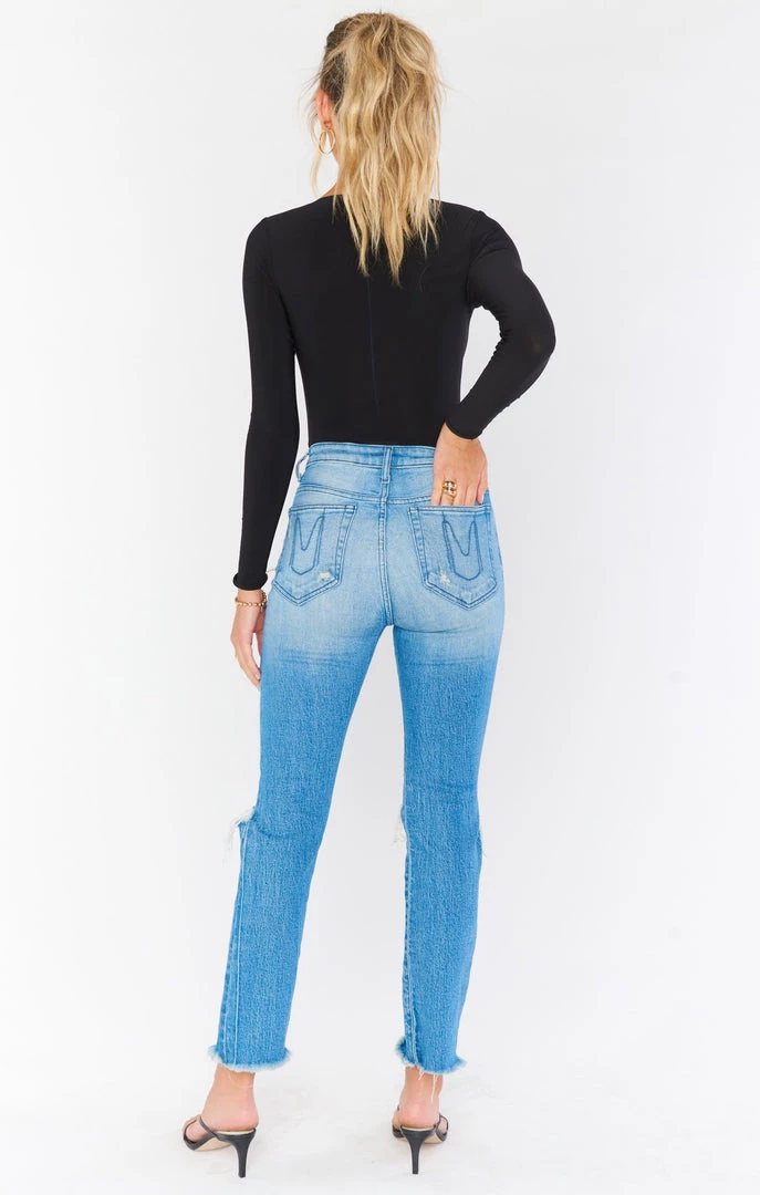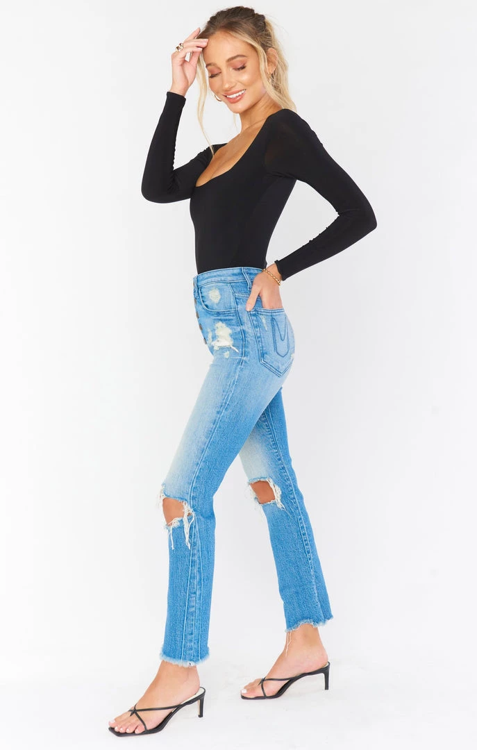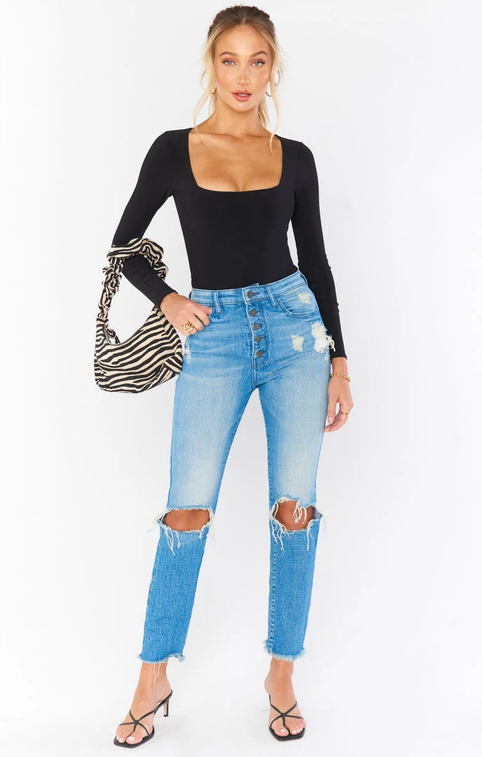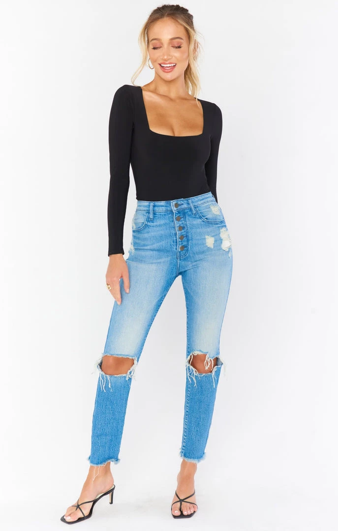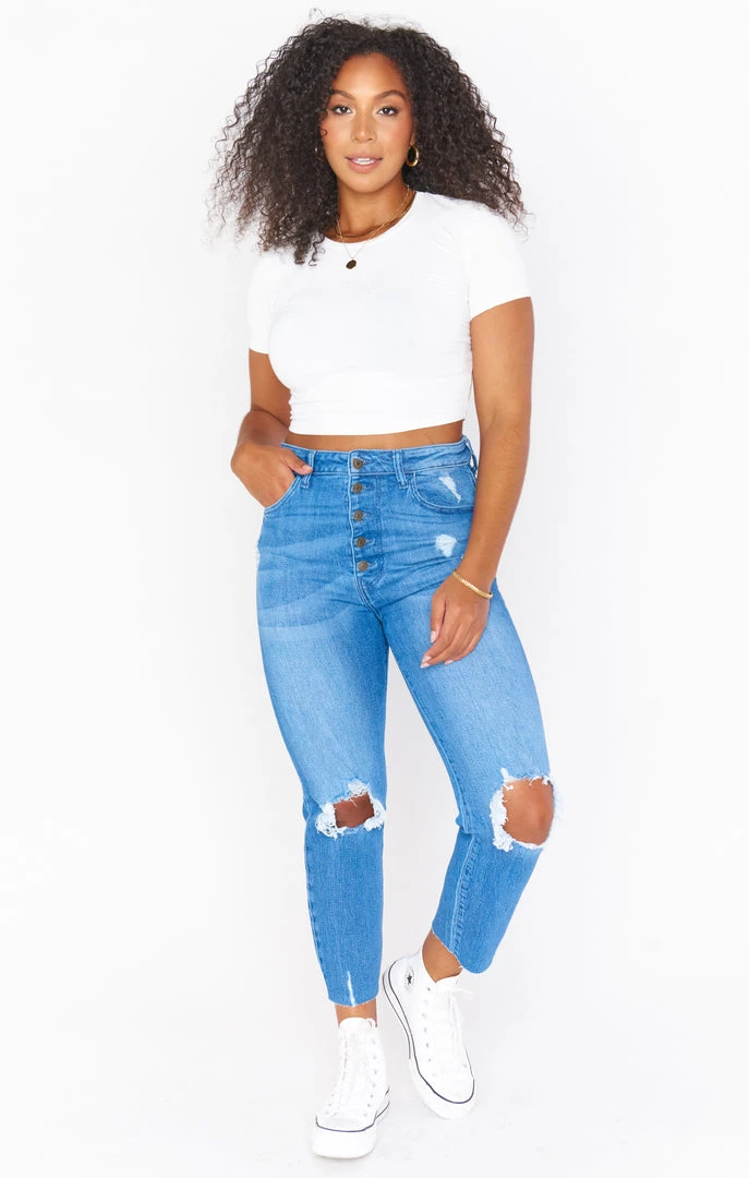 The literal perfect cropped skinny jean with a full button fly if you want a cropped look or are on the shorter side! You’d never know by just looking but this denim is super stretchy giving them a structured look but are incredibly comfortable