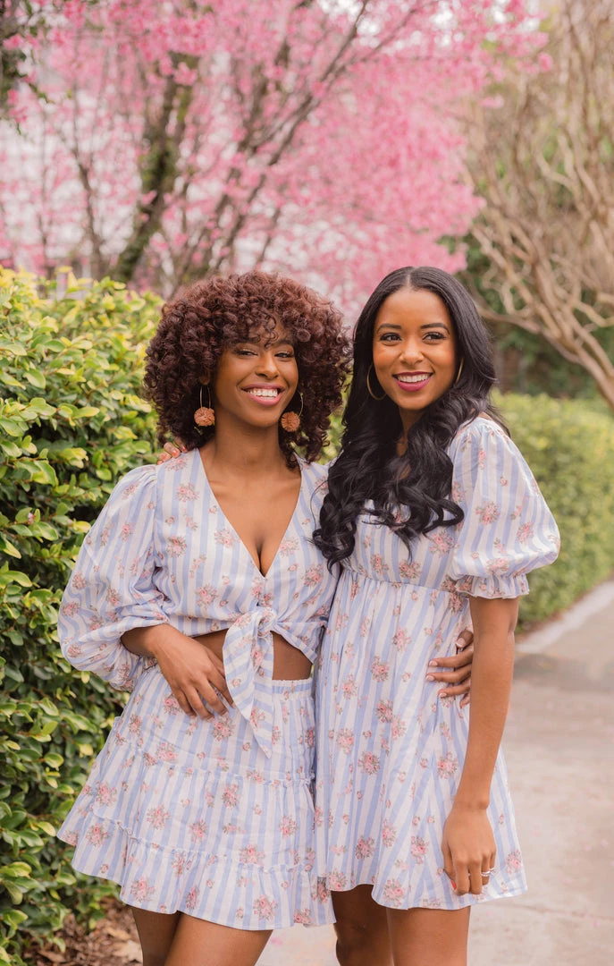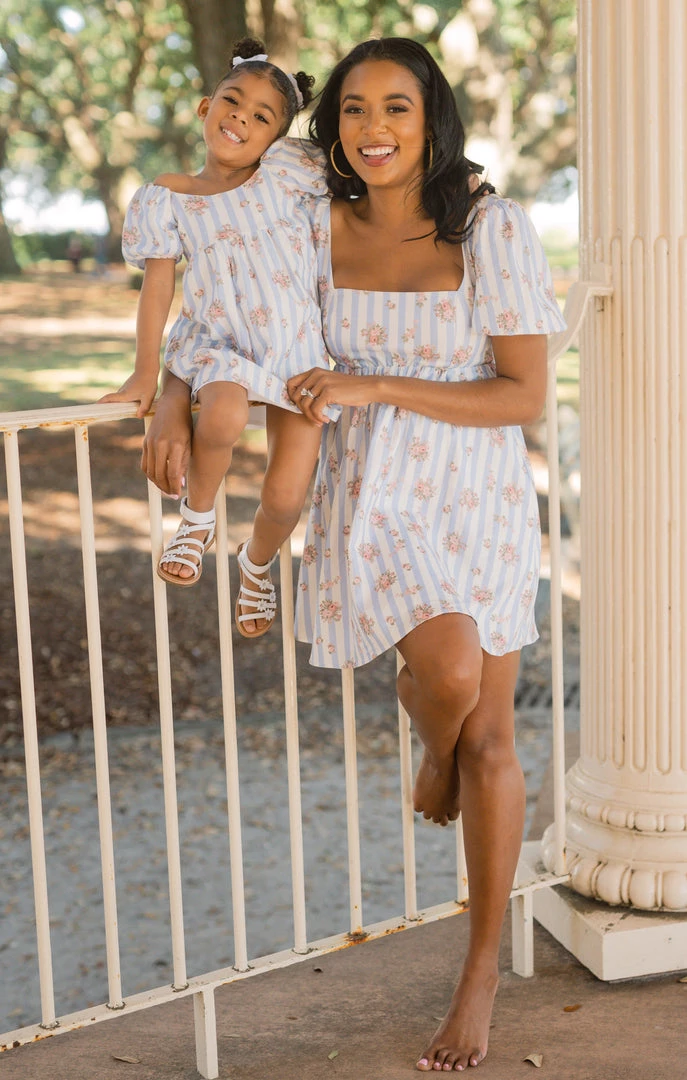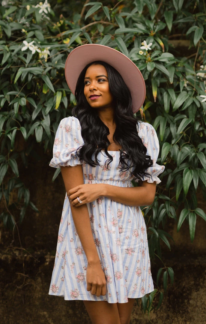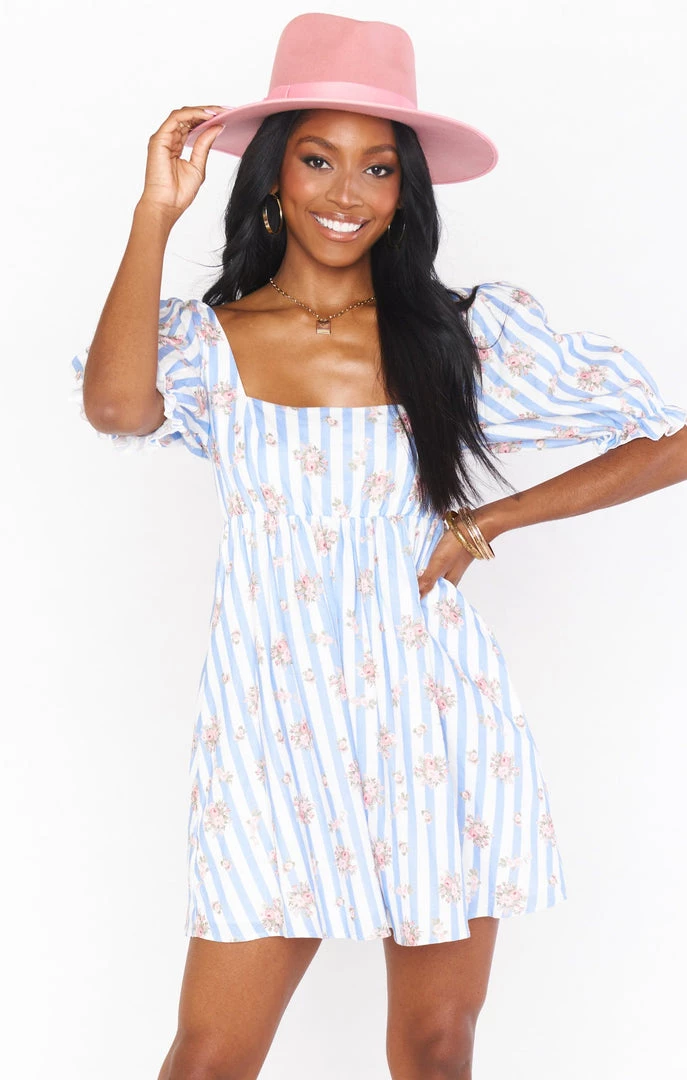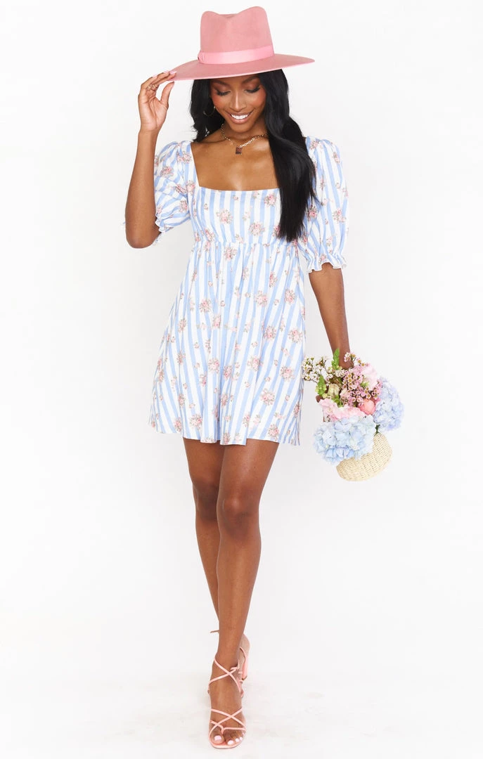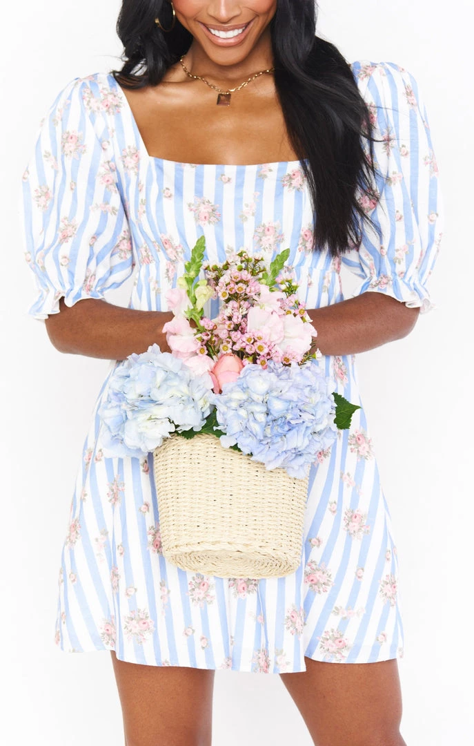 Perfect for sunny days, this blue and white striped floral print mini has a smocked back panel for a comfortable fit, a square neckline to accentuate your femininity + classic puff sleeves that are sure to make a statement