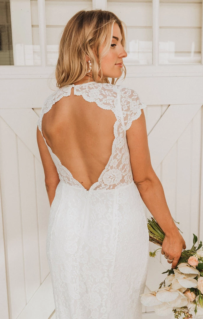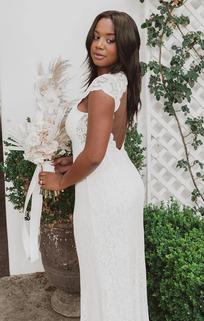 This stretch lace maxi has an cut out back mirrored with a scooped out v-neck to to create an elegant bodice met with a full skirt with a hint of mermaid. The stretch lace fits snug to flatter but is still ultra comfortable. Whether you are an eloping bride or celebrating your engagement the Brooke Maxi is ready!