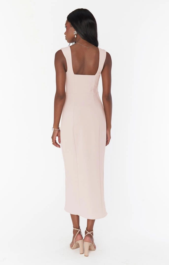 This fitted midi dress is as flattering as it is comfortable. Dusty blush stretchy fabric holds in all the right places, punctuated with a side slit. The square neck is complemented with a thicker strap to make sure you feel secure no matter where you wear her!