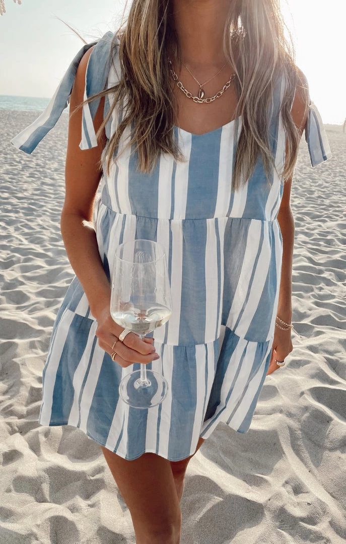 This blue and white striped mini dress of your warm weather dreams has an oversized, tiered, flowy body, a flattering v-neckline, and adorable self tie straps to adjust to your liking. The Emme Tie Dress is super versatile, making her adorable for brunch and perfect as a swim cover up on the way to the pool!