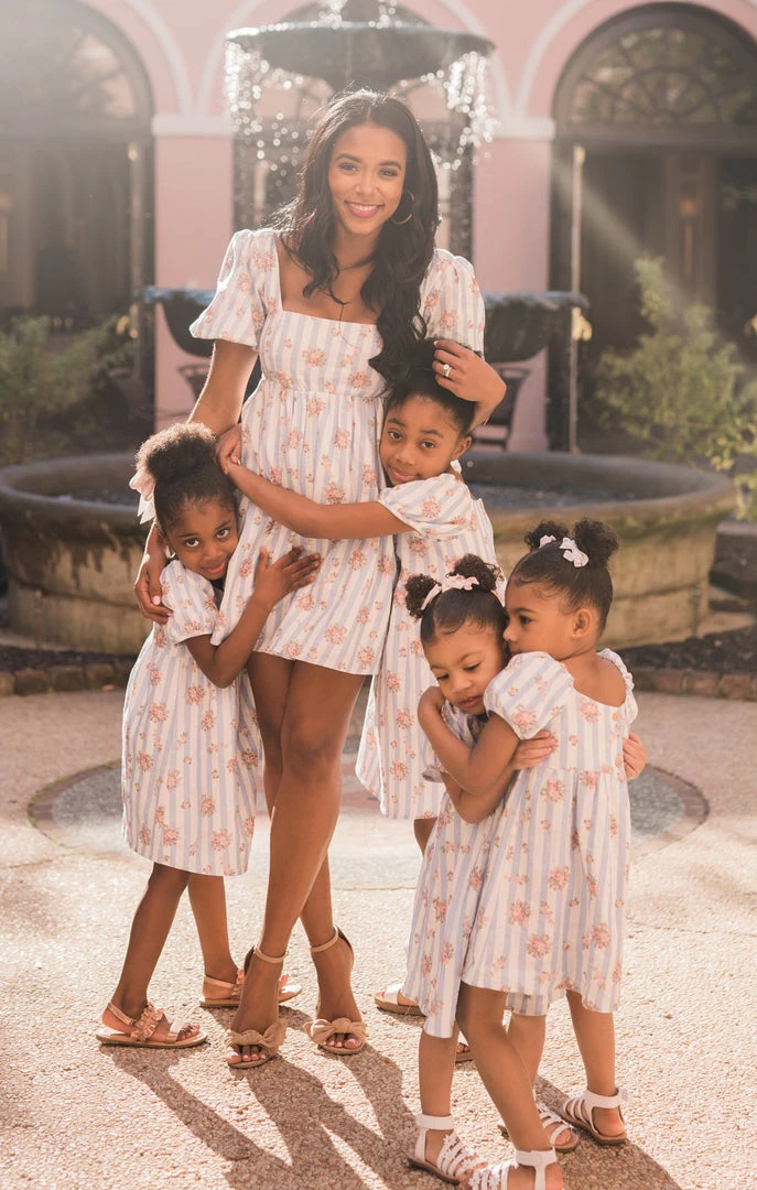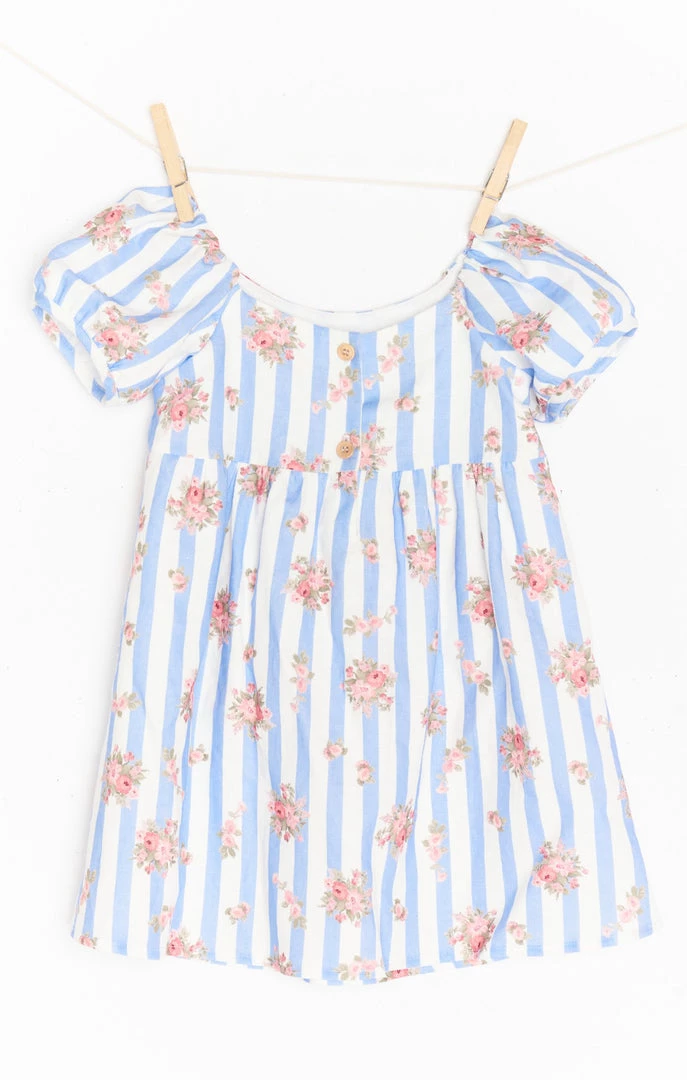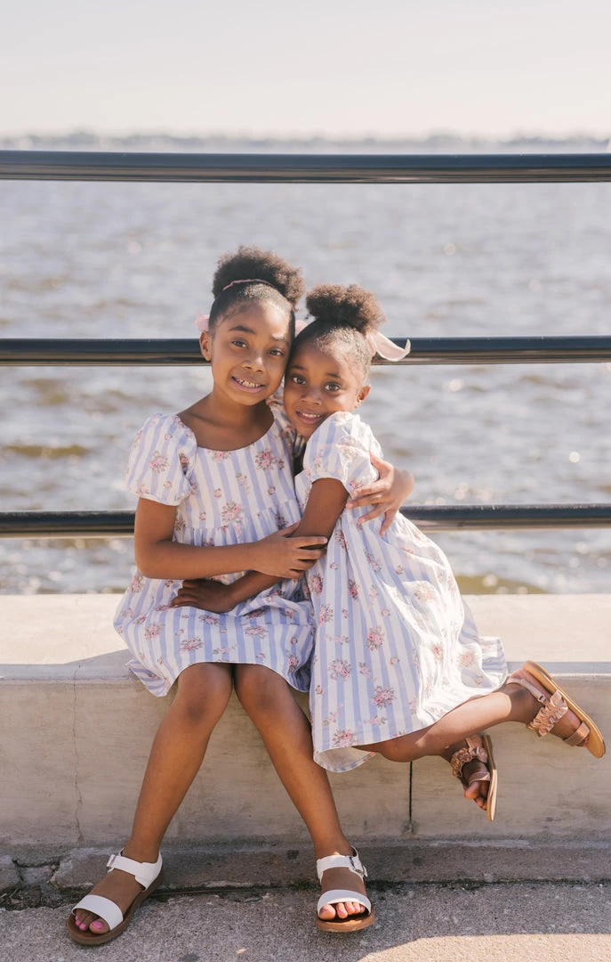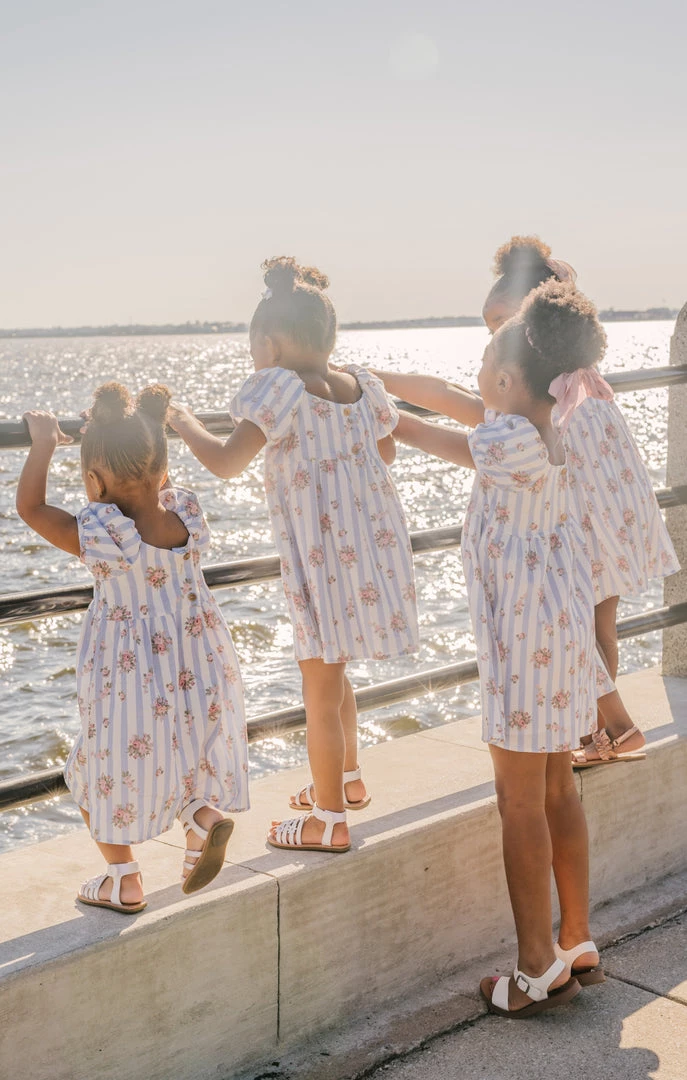 The most precious dress for your mini me! This sweet lil puff sleeved blue and white striped floral dress is great for your family photos or tagging along to a special event!