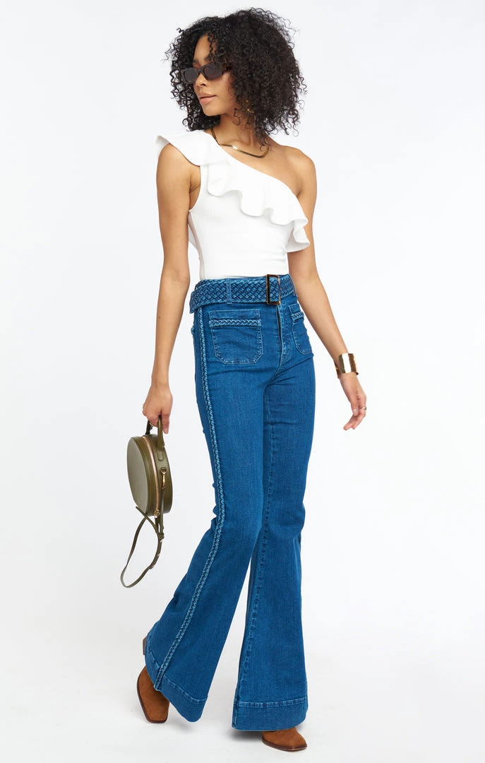 Charlie’s Favorite Mu Angel has just arrived complete with a slimming retro high waist, high pockets and the perfect 70’s flare leg! This pair of Farrahs has a braided denim belt and a bit more braided detail on the pockets! Bright enough for a sunshiney day but dark enough to feel sleek and cool