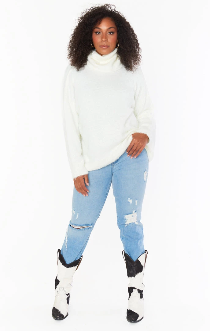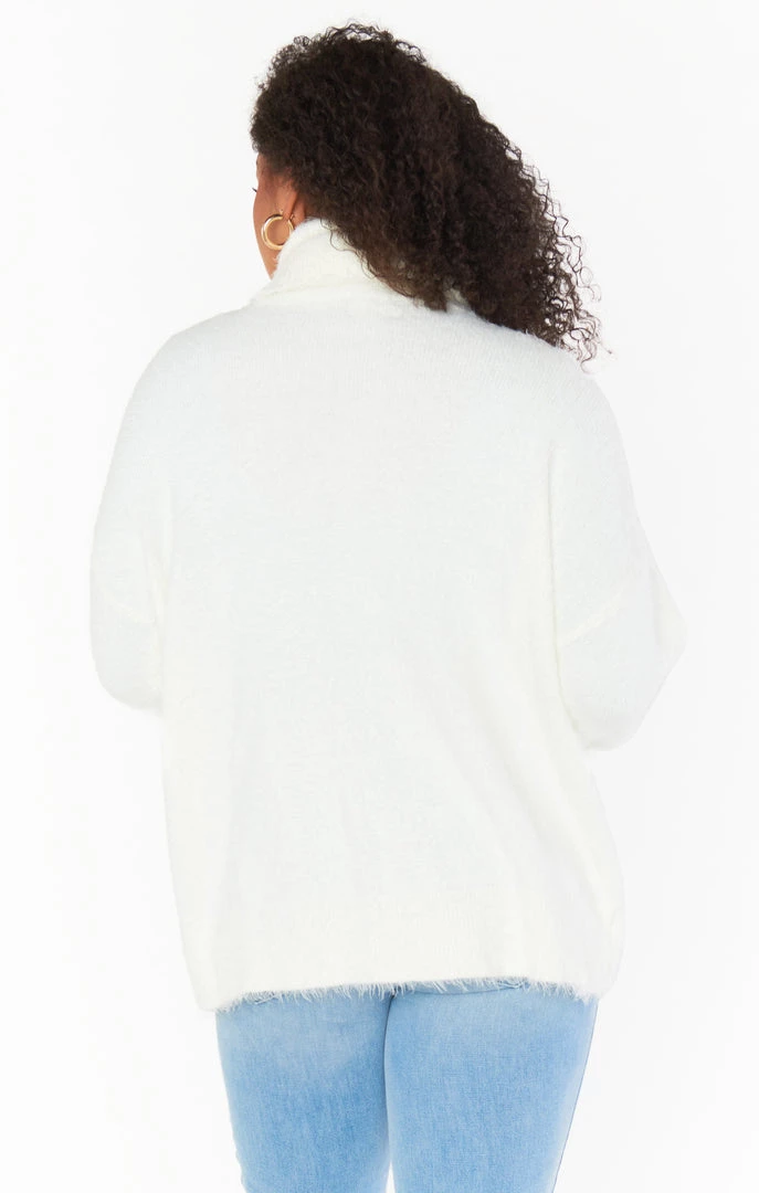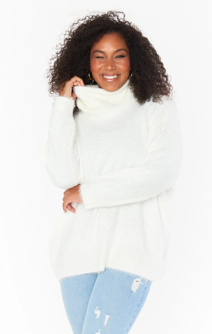 Super soft and oversized fuzzy white turtleneck sweater. This chunky and cozy sweater is perfect for cold weather, feel bundled up but cute in this Fatima sweater