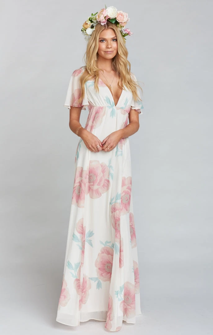 The Faye Flutter Maxi has a longer flouncy sleeve and low neckline meeting at an empire waist so you can’t be anything but gorge. A tie at the back shoulder ensures you’re tucked in for the night, while an open back gives a touch of skin. For our gals with a bigger chest, consider sizing up and adding a hook and eye.