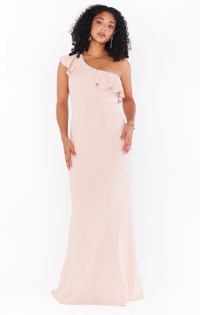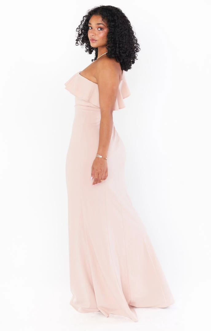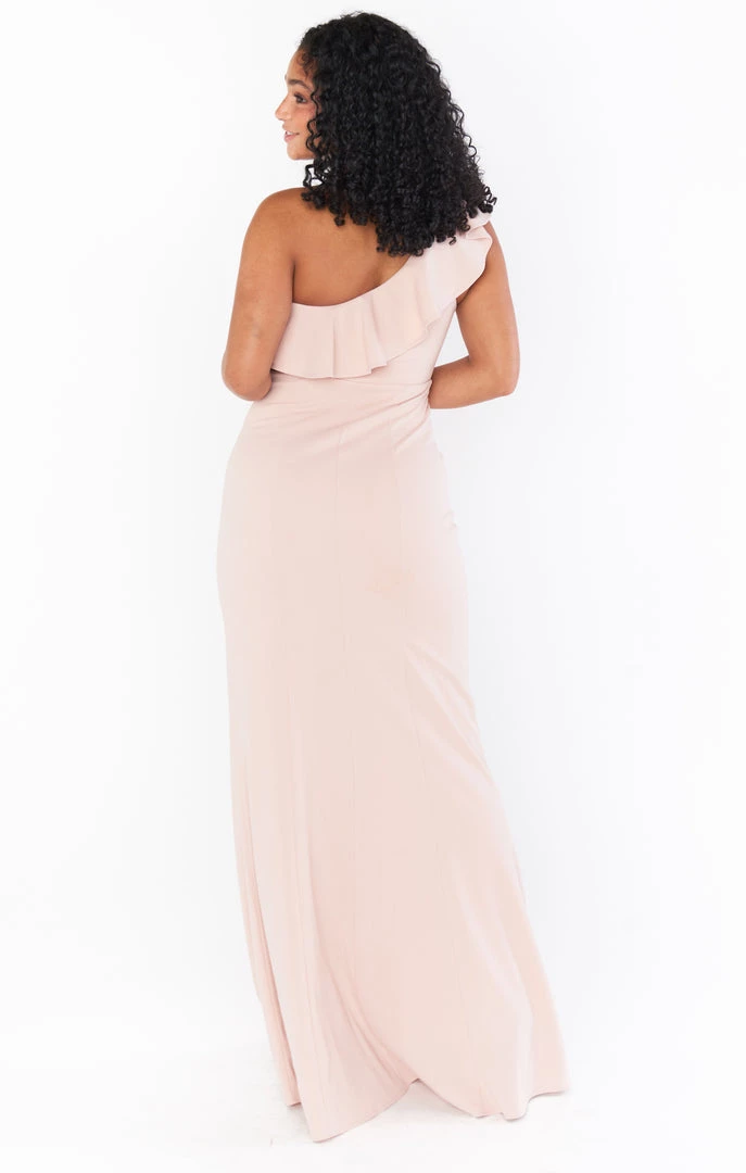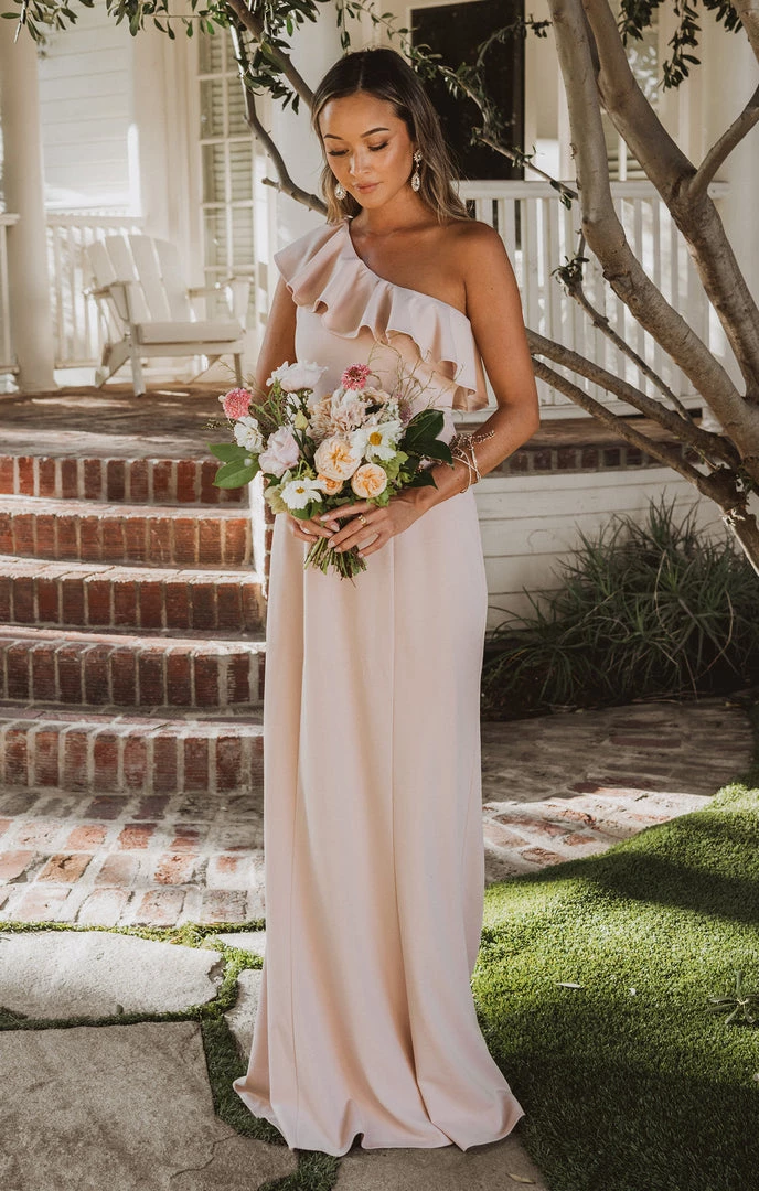 A romantic one shoulder maxi with a gentle ruffle and flattering fit. Fitted in all the right places, this super soft and form fitting maxi is strapless bra friendly if you need and might need some shapewear if you’re feelin it. But this one shoulder silhouette is super on trend for your bridesmaids or even as a guest!