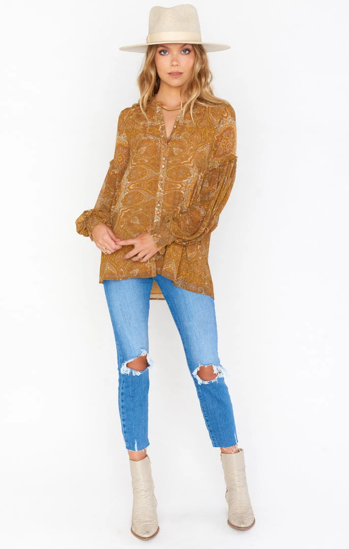 This is the bohemian blouse of our dreams! Feel beautiful and breezy in our golden paisley chiffon, cinched bubble sleeves, and adorable button up detailing. Pair with denim for a causal look or the Berkeley bells in golden paisley for a matching look that is to die for!