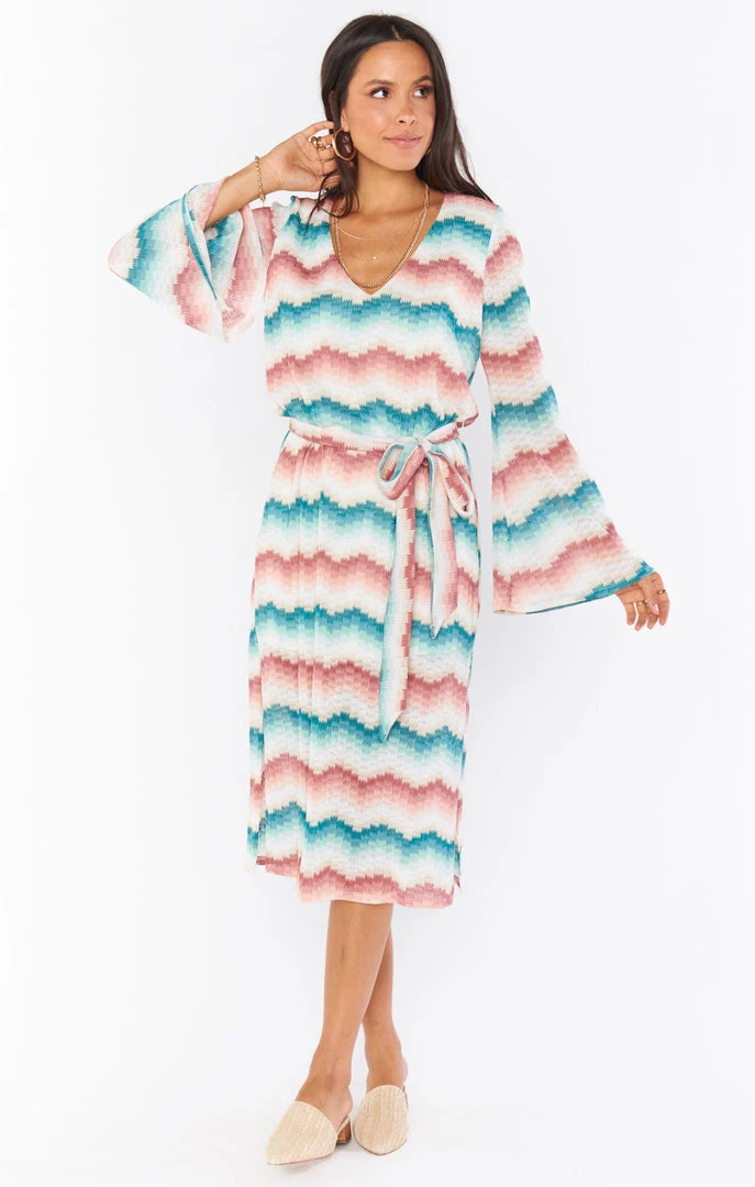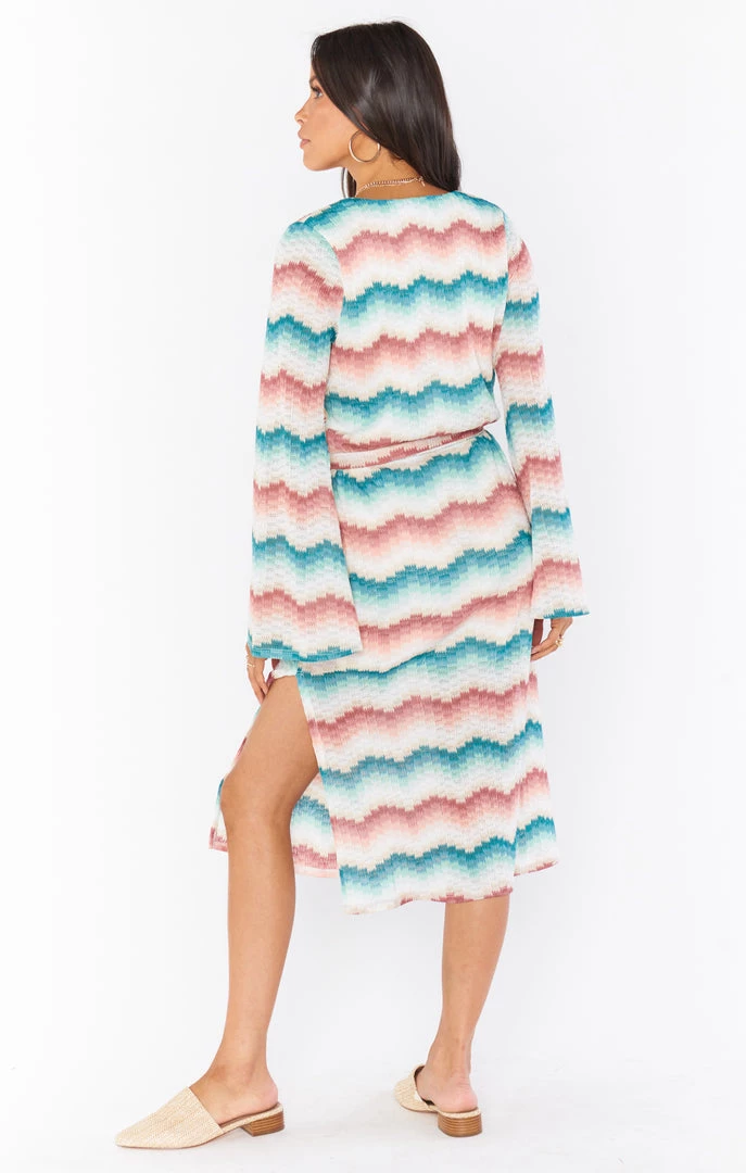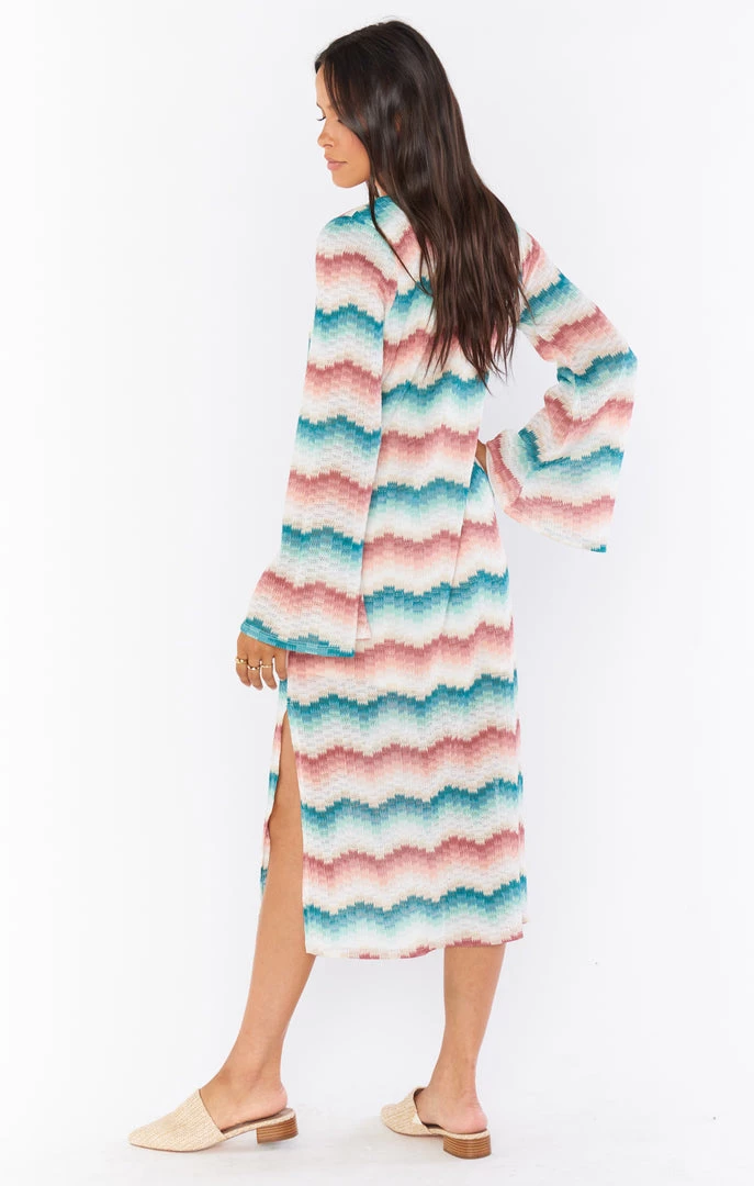 In our colorful catch waves knit this v-neck cover up is an eye catching piece you will aboslutely love! We created this breezy dress with flared sleeves, side slits and a removable tie to cinch at the waist so you can go from brunch to the beach in style!