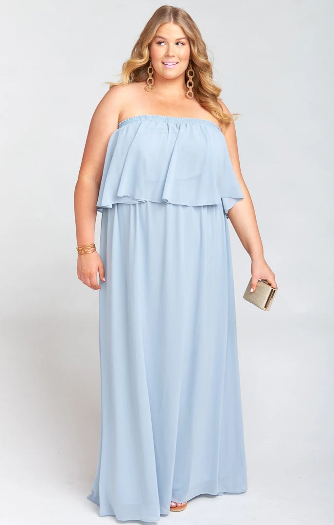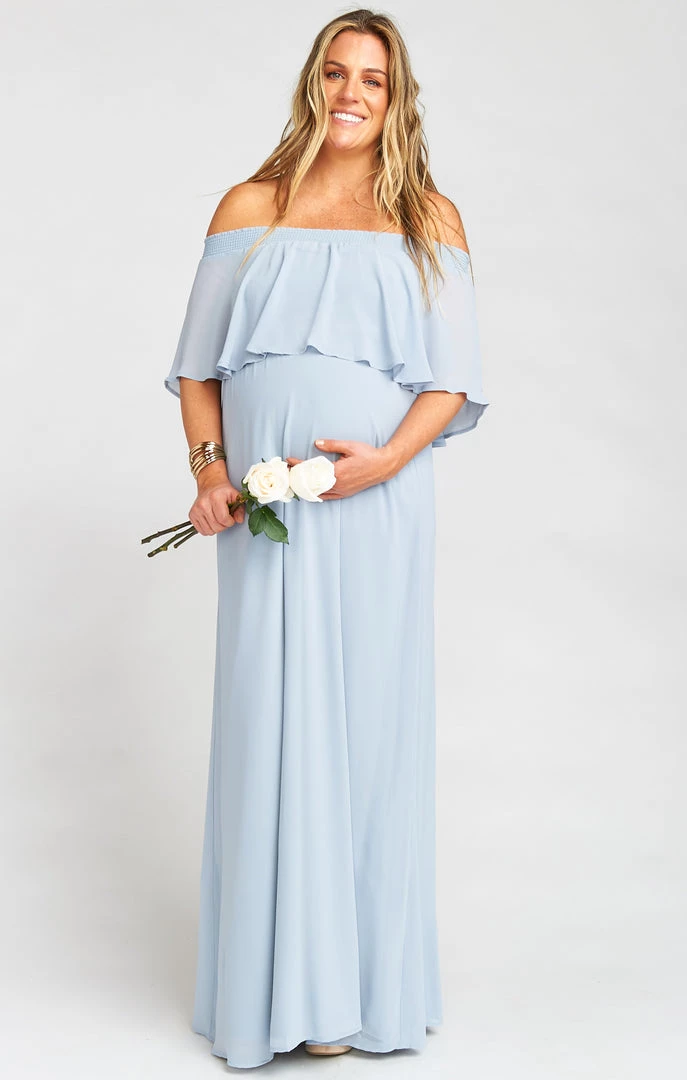 The Hacienda Maxi’s versatile ruffle top has an elastic neckline to wear off the shoulder, strapless, and one shoulder. Cinches at the waist with elastic to flatter no matter which shoulder her ruffle sits on.