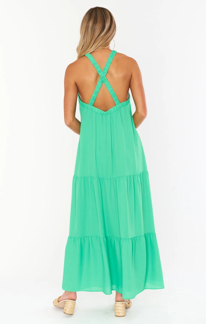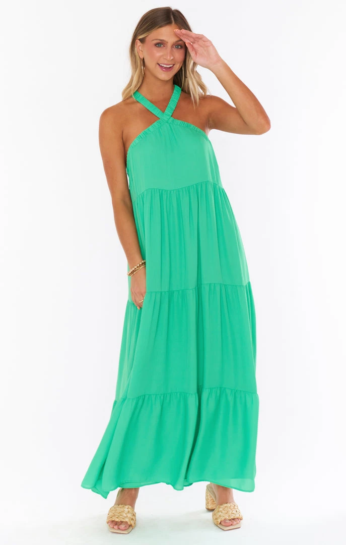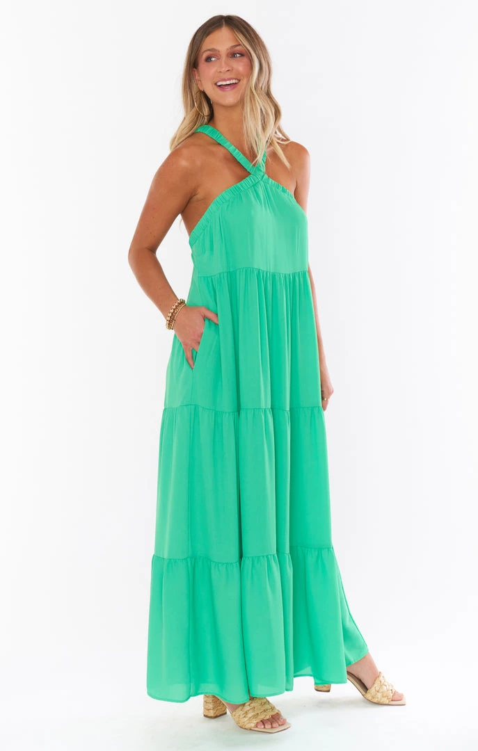 Welcome sunny days in this green halter maxi dress! Smocked elastic straps meet at a high neck in the front, and cross in the back for the perfect mix of flattering and functional. Tiered shearing sets this apart from the rest and bonus points for pockets!