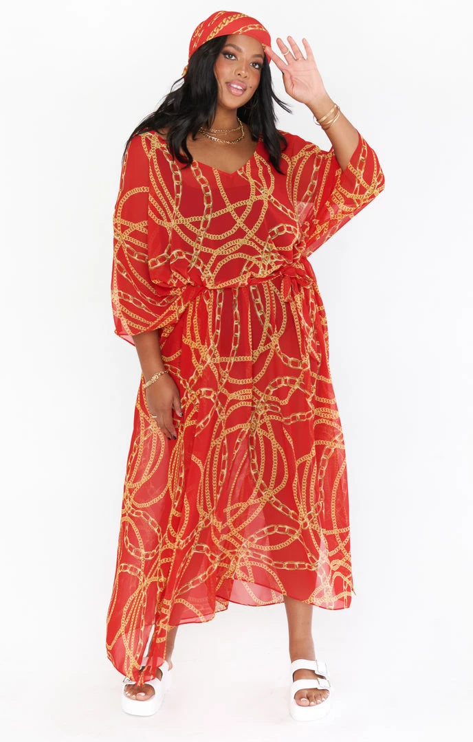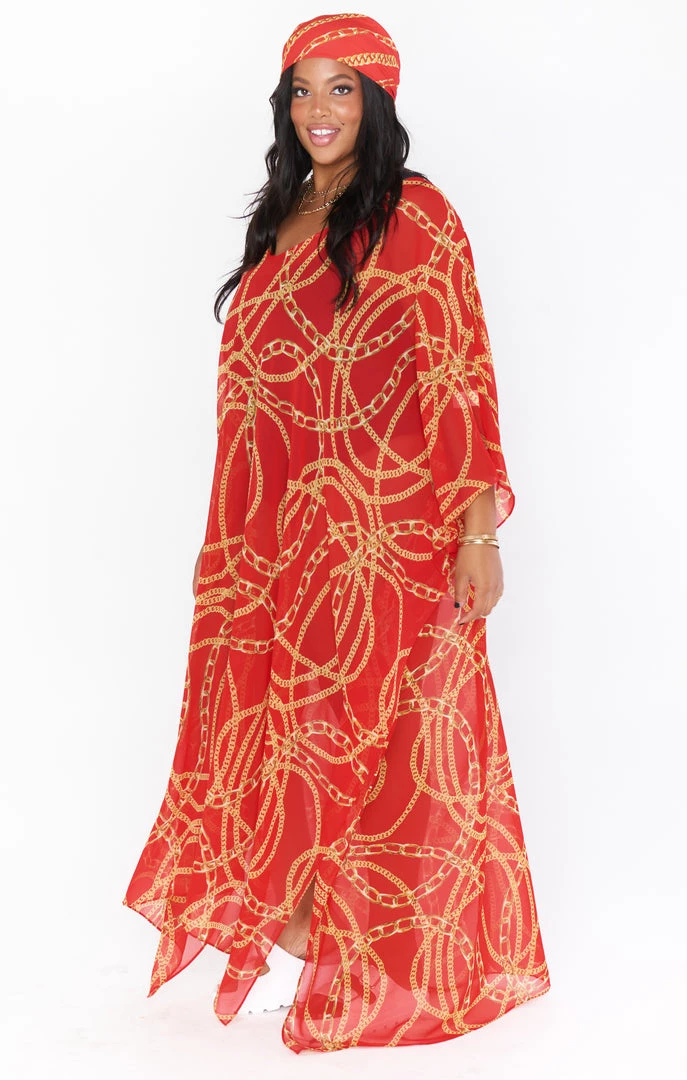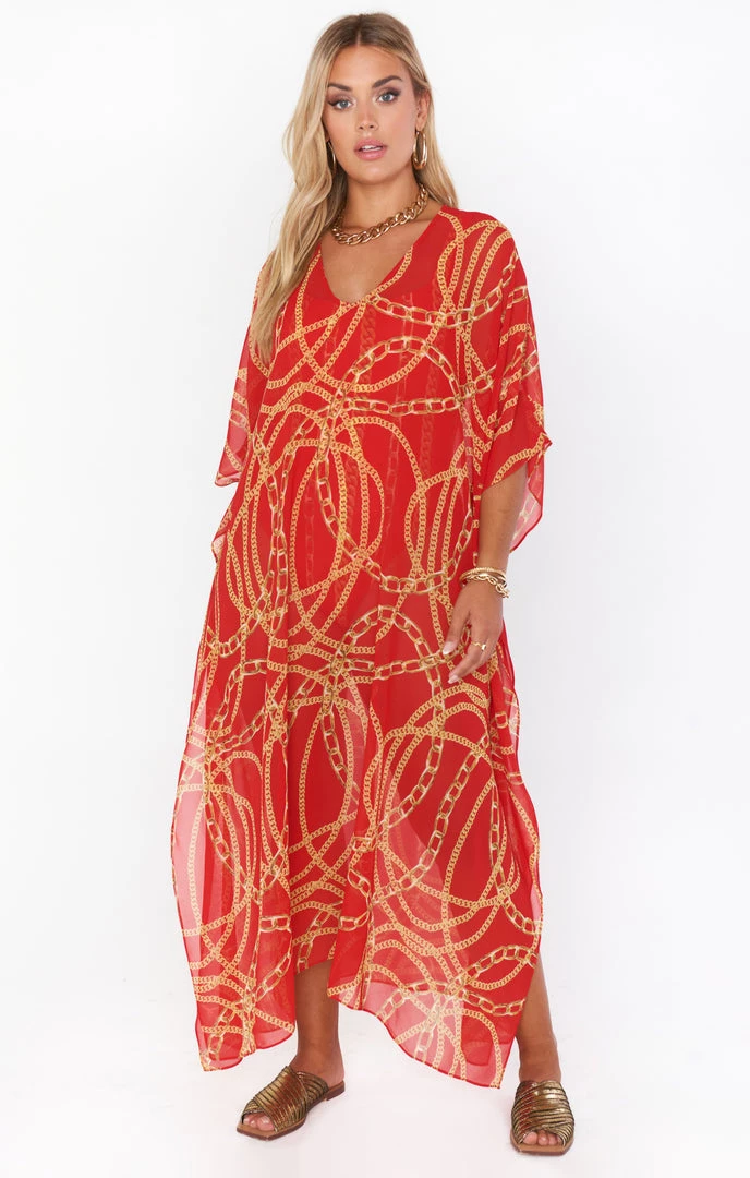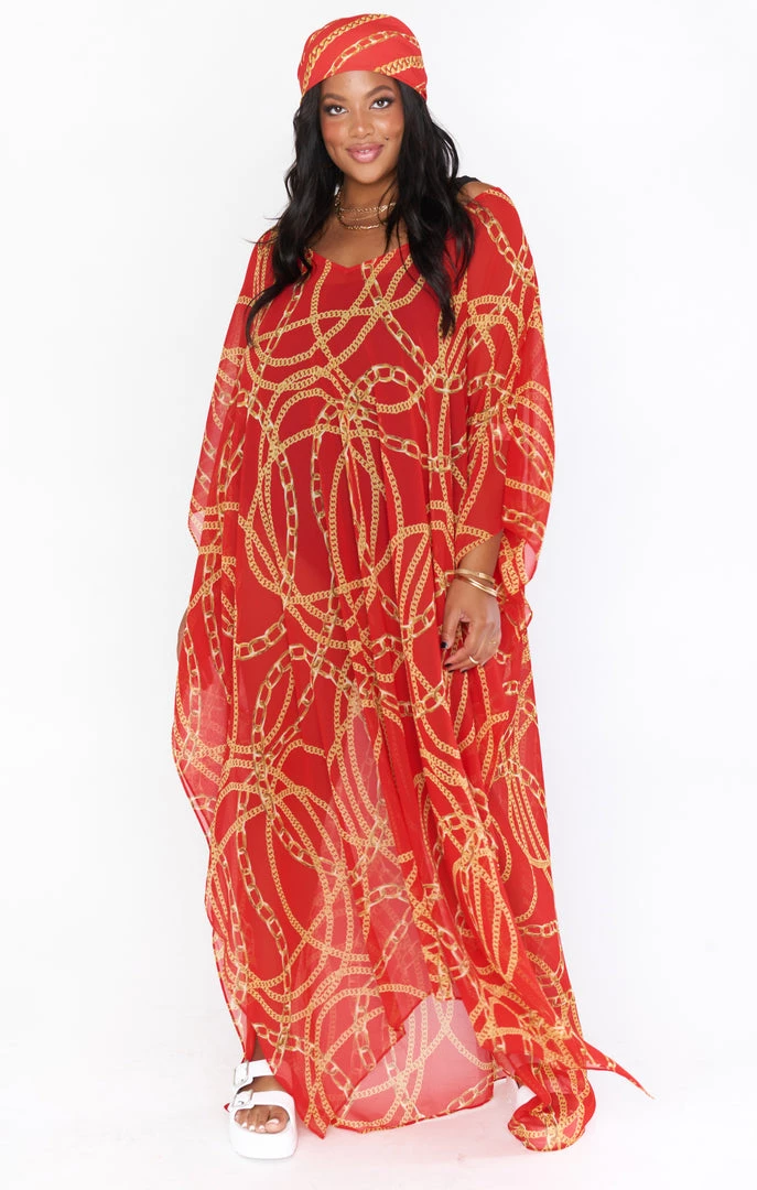 The Hana is a true Mumu OG, her perfectly flowy kaftan body is the epitome of regal. While primarily a swim cover up she is chic as can be with a slip dress underneath or even a tight top and denim shorts. Wherever you end up in this oversized red chain maxi you will be looking effortlessly riche!