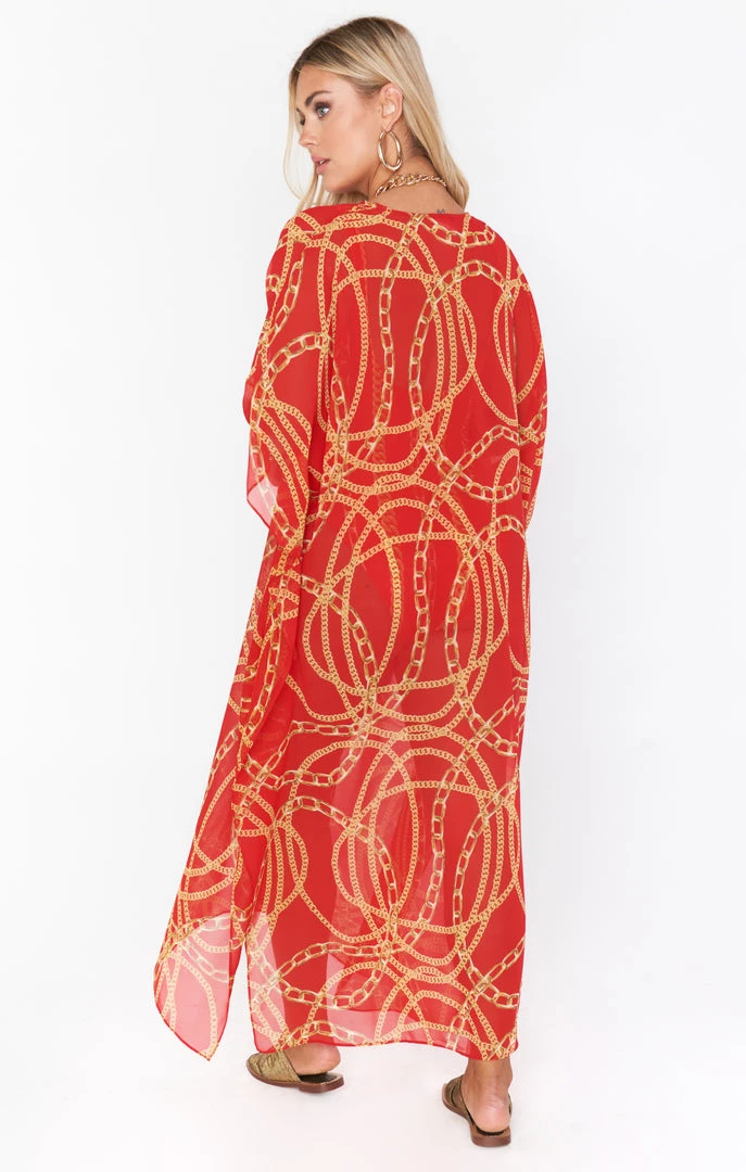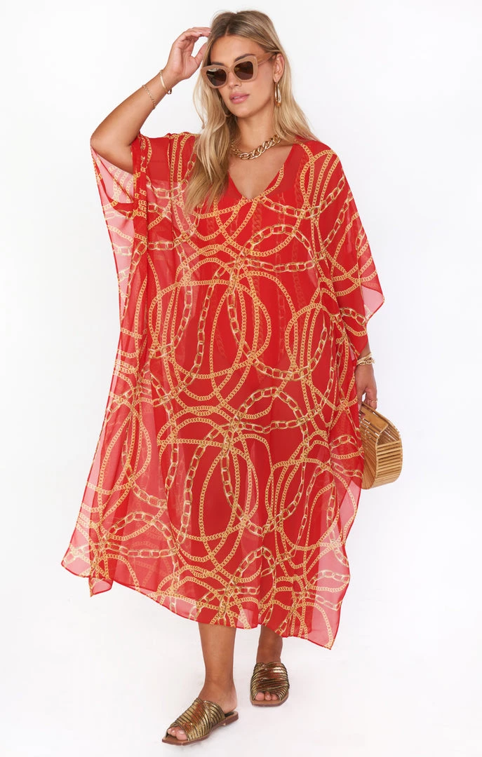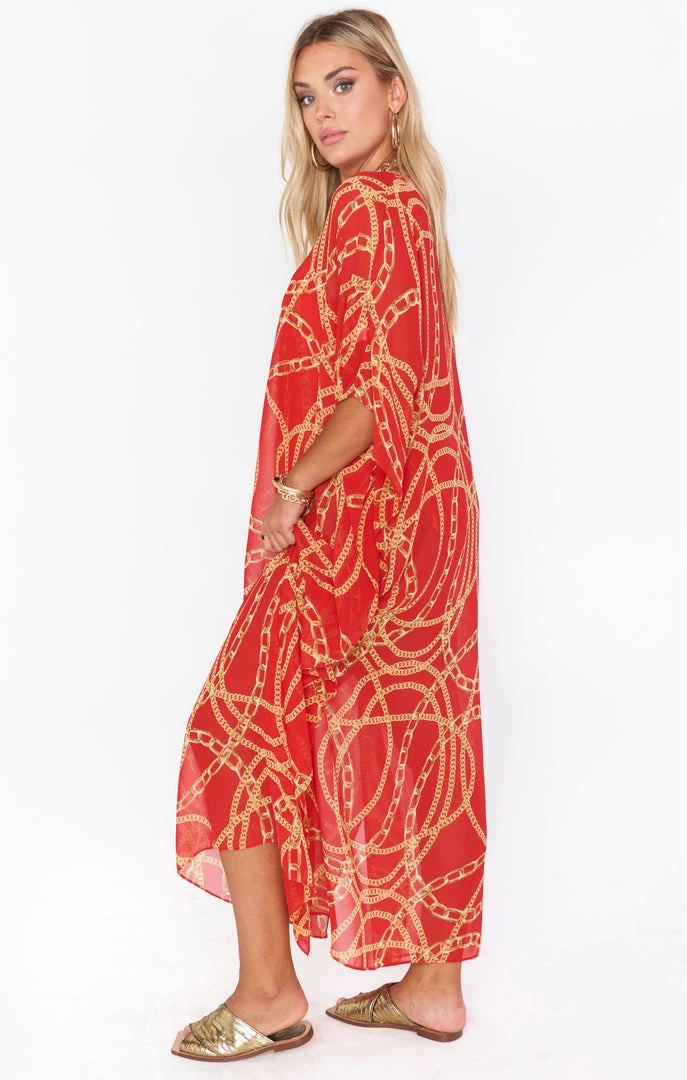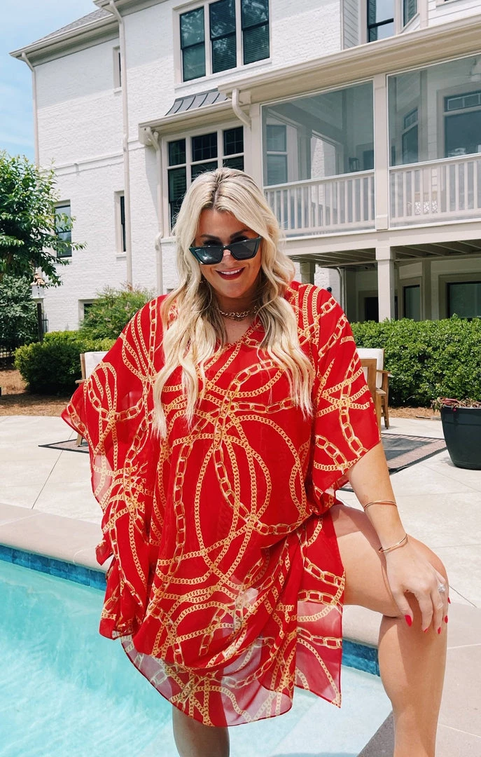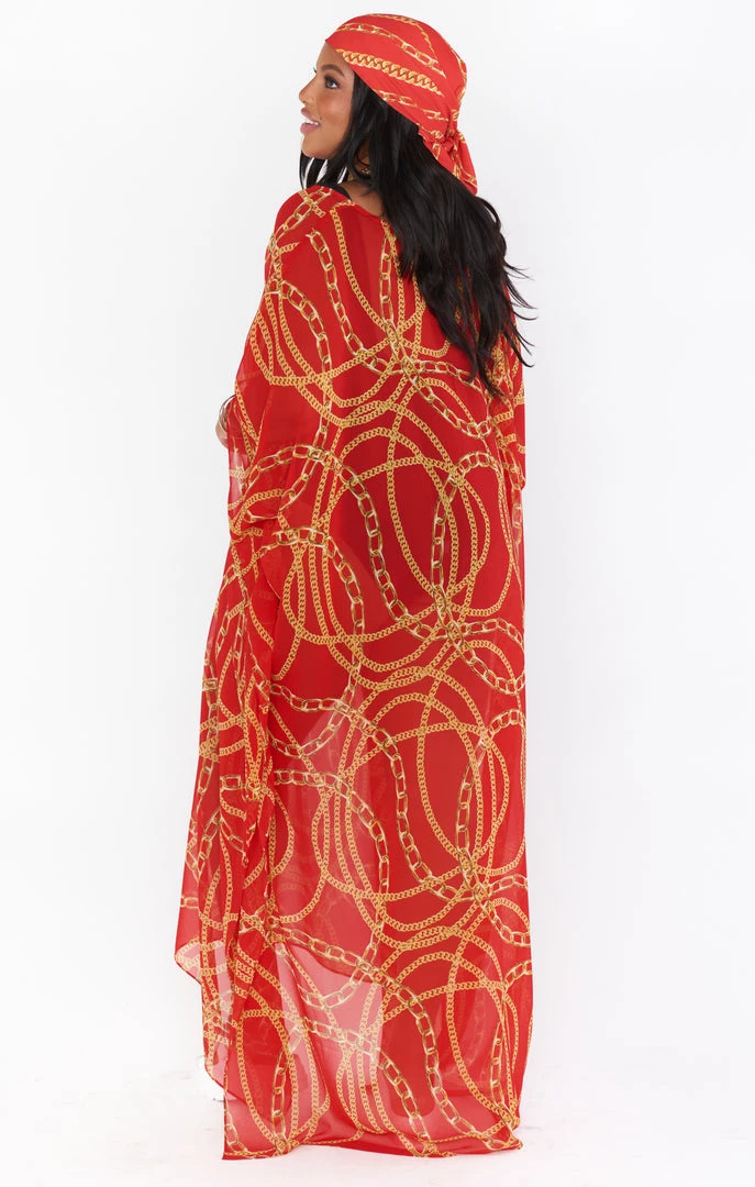 The Hana is a true Mumu OG, her perfectly flowy kaftan body is the epitome of regal. While primarily a swim cover up she is chic as can be with a slip dress underneath or even a tight top and denim shorts. Wherever you end up in this oversized red chain maxi you will be looking effortlessly riche!