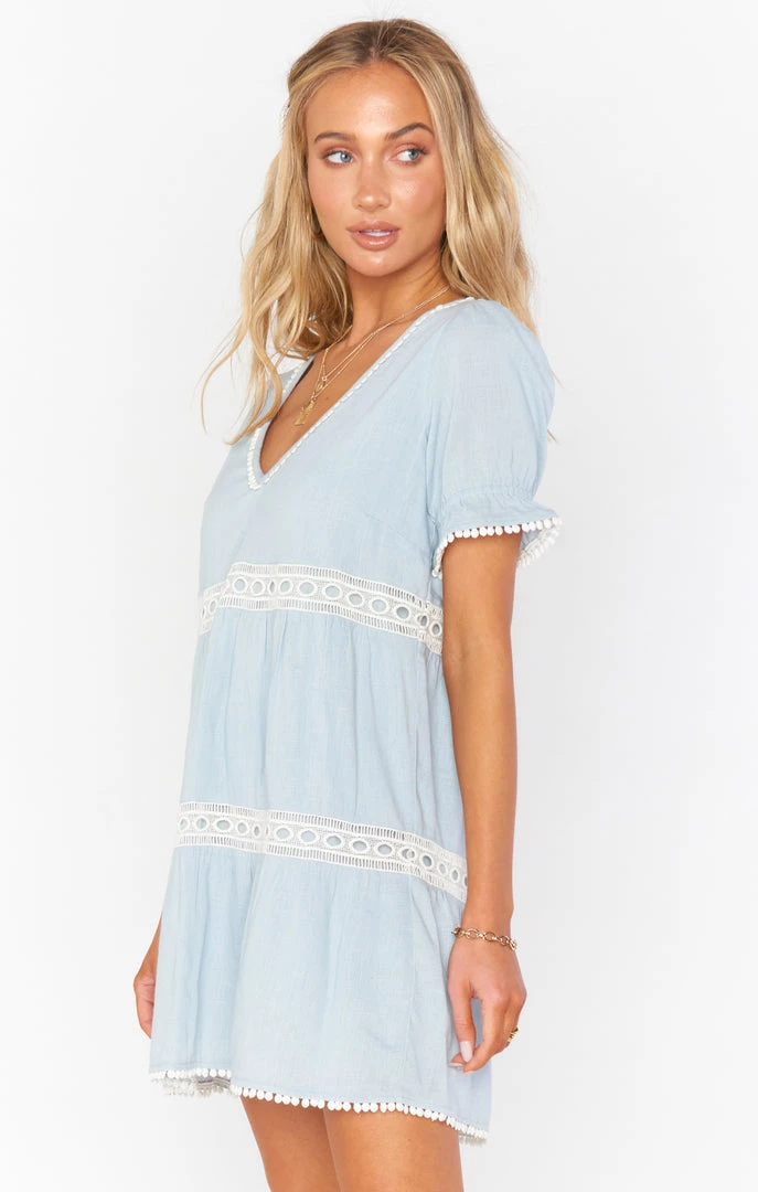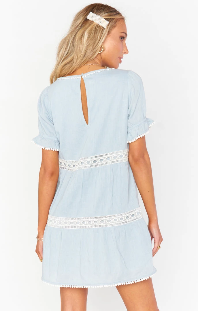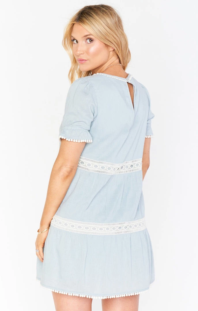 This sky blue cotton mini dress is easily our new crush. Her feminine trim detail with a gently puffed sleeve give us all the feels, while her v neck and flowy body keep her flattering and very wearable.