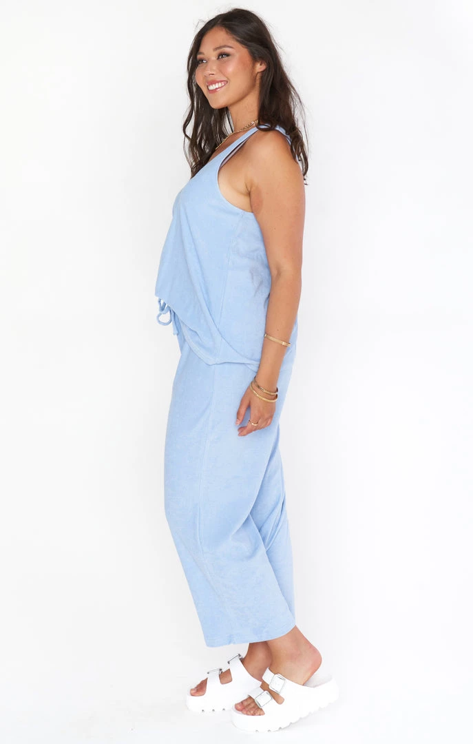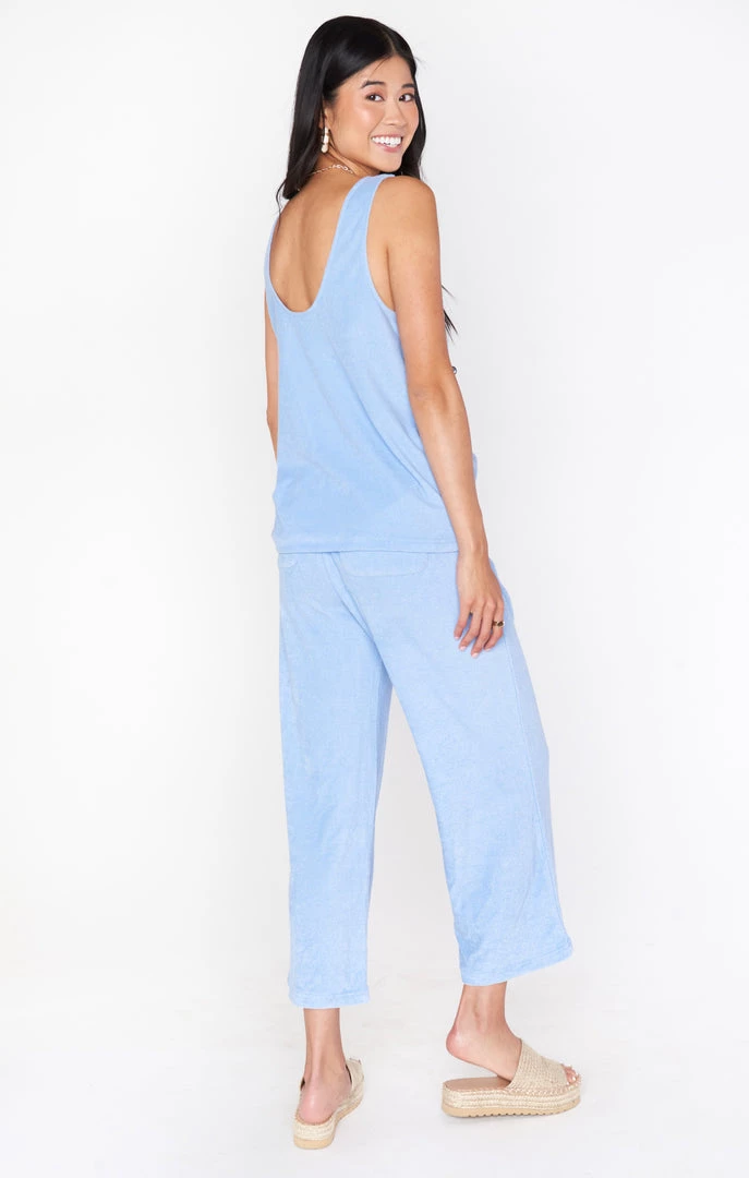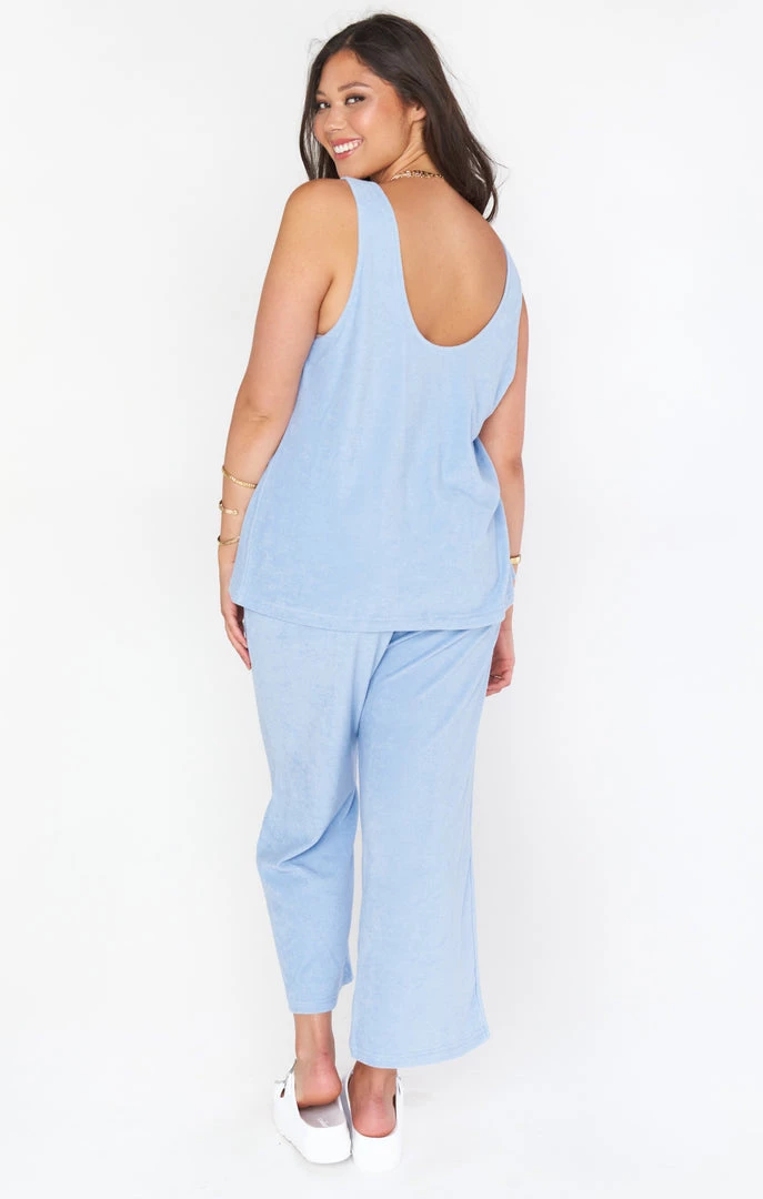 Homebody or social butterfly, you won’t want to take off this periwinkle terry set. Easy scoop neck tank and draw-string, billowing pants will have you feeling just as comfy as cute! Pair with our matching periwinkle swim for a full monochromatic look.